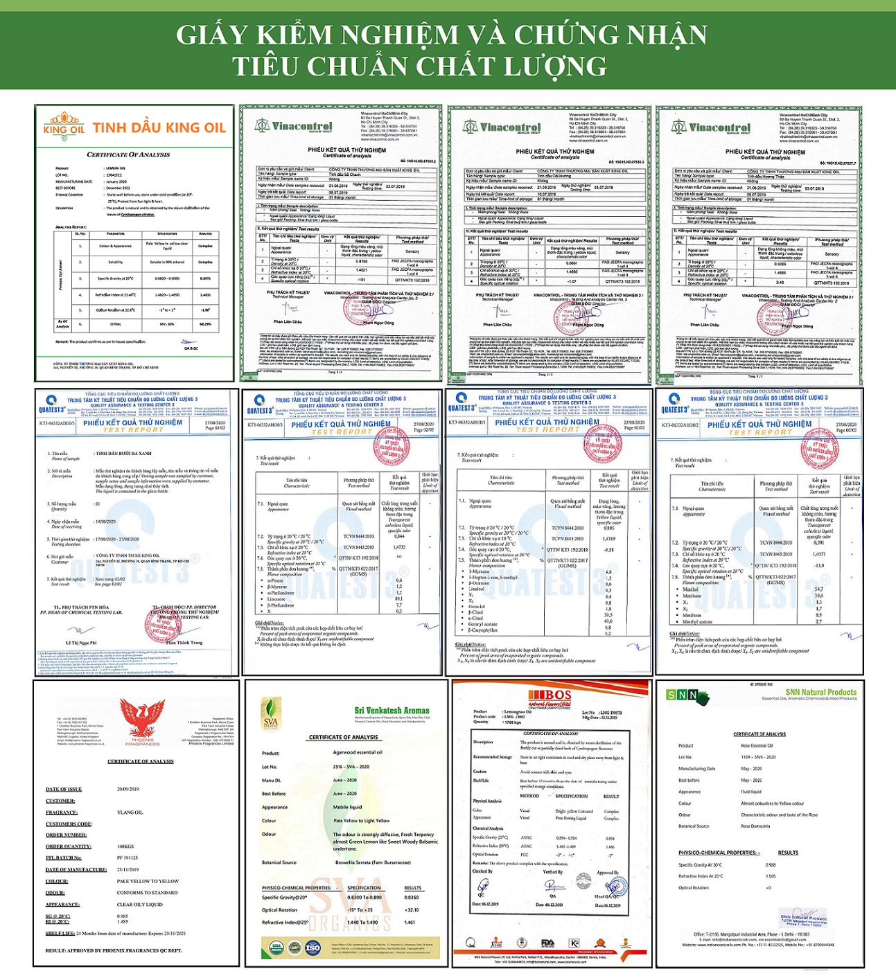Sản phẩm đạt mọi bài kiểm định chất lượng quốc tế và Việt Nam về độ an toàn, không có hại cho sức khỏe, tiêu chuẩn USDA về độ tinh khiết của sản phẩm tinh dầu