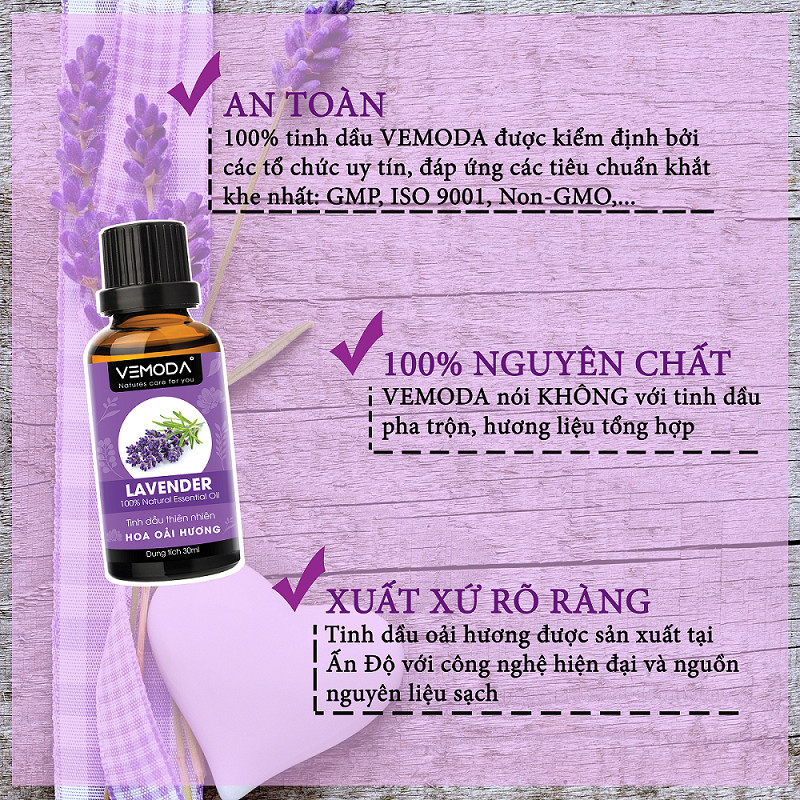 TINH DẦU OẢI HƯƠNG CAO CẤP VEMODA 30ML Tinh dầu Oải hương nguyên chất Vemoda 30ML giúp thư giãn, chống lại quá trình oxy hóa, cải thiện tâm trạng, làm đẹp Tinh dầu Oải hương cao cấp Vemoda được nhập khẩu trực tiếp từ Ấn Độ - một trong những quốc gia sản xuất tinh dầu hàng đầu thế giới. Các sản phẩm tinh dầu Oải hương Vemoda đều được tiến hành lấy mẫu và kiểm nghiệm tại Trung tâm kỹ thuật tiêu chuẩn đo lường chất lượng 3 (QUATEST 3)/ Tổng cục tiêu chuẩn đo lường chất lượng để đảm bảo chất lượng sản phẩm đúng tiêu chuẩn và tốt nhất cho khách hàng. Với Vemoda, an toàn sức khỏe người tiêu dùng luôn được đặt lên hàng đầu. NGUỒN GỐC VÀ CHẤT LƯỢNG TINH DẦU OẢI HƯƠNG - LAVENDER ESSENTIAL OIL