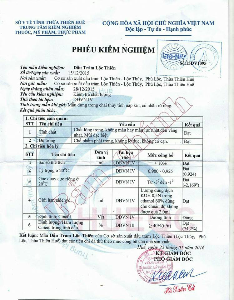 Thành phần Chiết xuất 100% từ lá tràm gió thiên nhiên thu hái tại Huế và Quảng Trị 2 tinh chất chính có tác dụng phòng và chữa bệnh: - Eucalyptol (1,8 cineol): 59,2% -