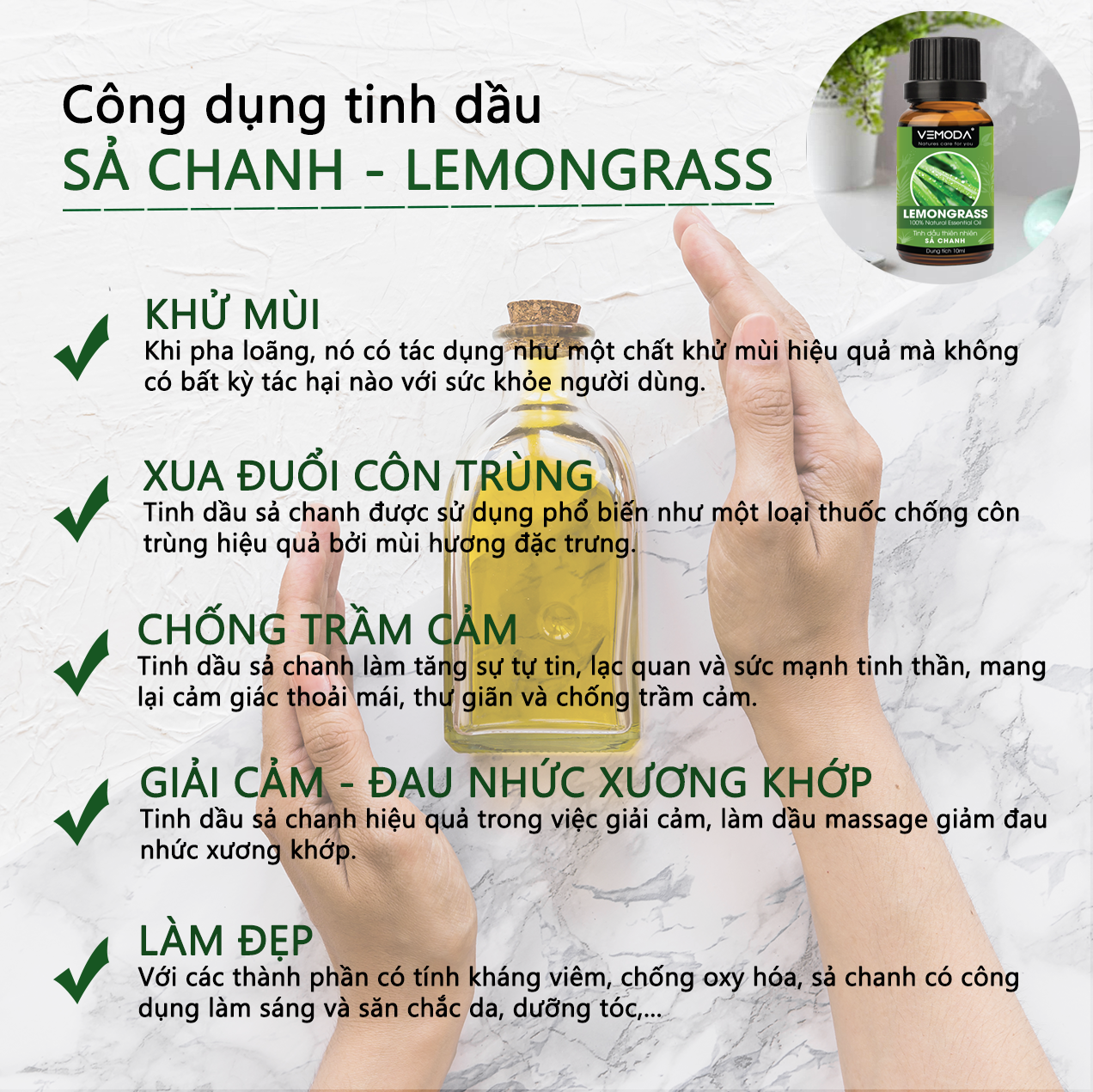 TINH DẦU SẢ CHANH CAO CẤP VEMODA 100ML Tinh dầu Sả chanh cao cấp Vemoda giúp khử mùi, xua đuổi côn trùng, chống trầm cảm, giải cảm, làm đẹp Tinh dầu Sả chanh cao cấp