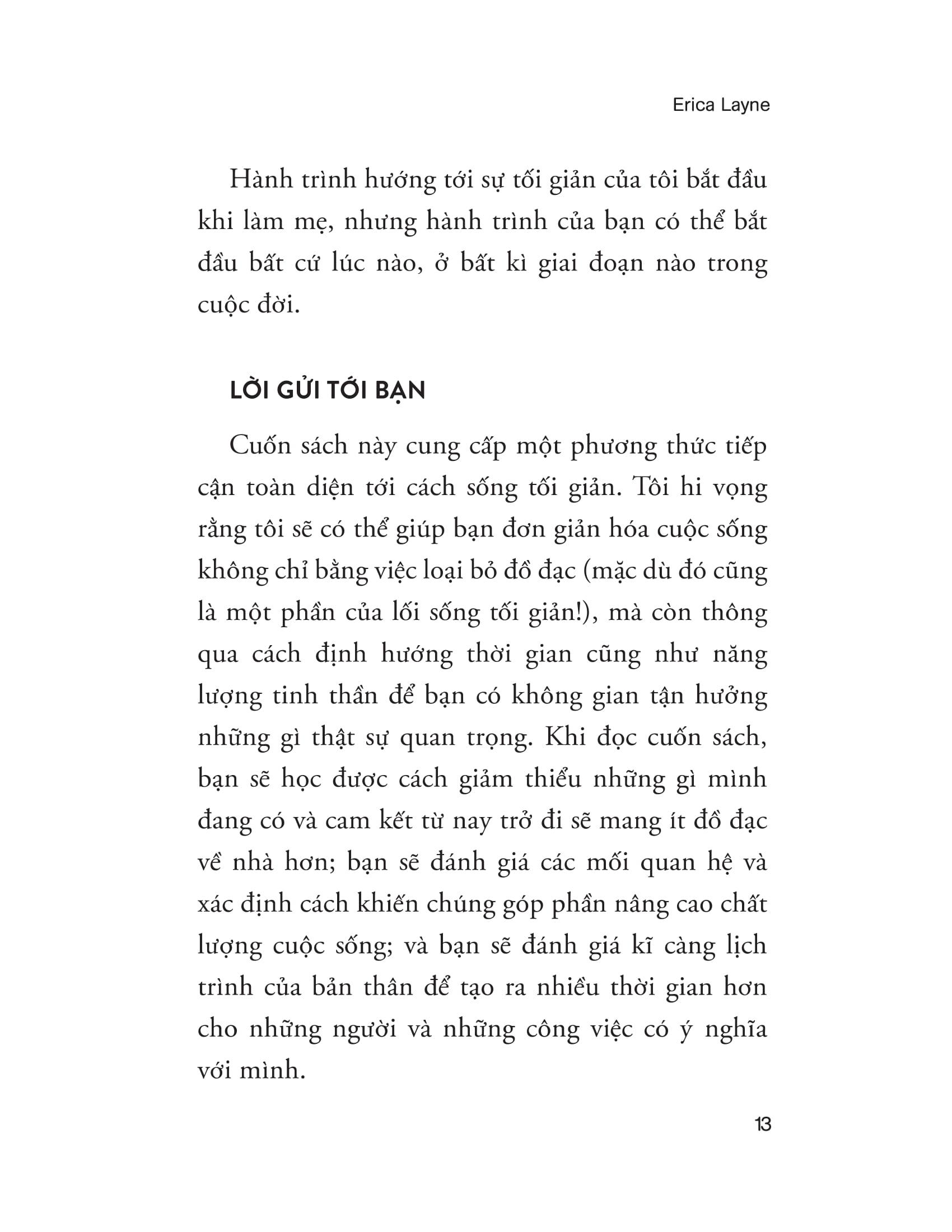 Thông qua cuốn sách của Erica Layne, hãy cùng khám phá cách áp dụng lối tư duy tối giản vào mọi khía cạnh của cuộc sống bằng cách thay đổi cách bạn nghĩ về nhà cửa, sự nghiệp, các mối quan hệ, gia đình và tiền bạ Với triết lý thực tế, các bài tập và hoạt động đơn giản cùng các chiến lược dễ áp dụng để loại bỏ những phiền nhiễu và căng thẳng không cần thiết, đây là cuốn sách hướng dẫn cần thiết cho bất cứ ai muốn giải tỏa sự lộn xộn về thể chất, tinh thần và cảm xúc.