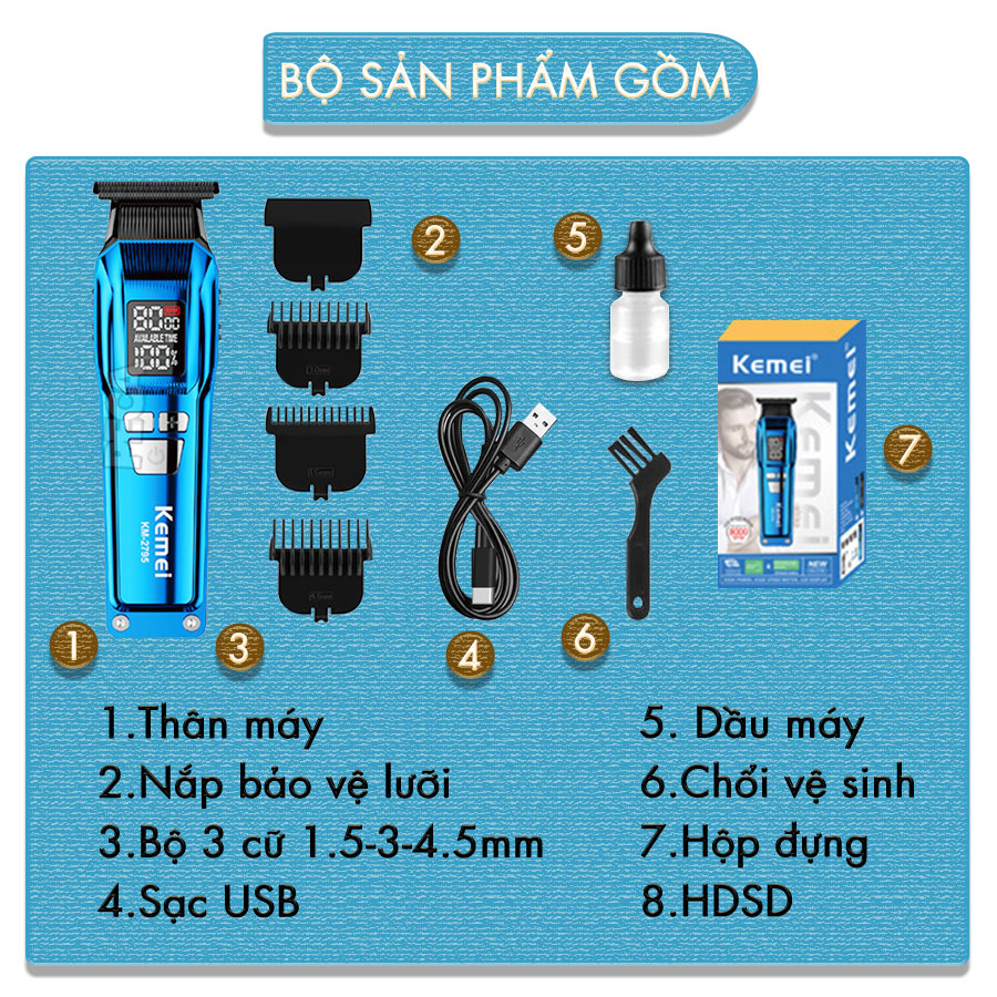 Bộ sản phẩm bao gồm: Thân máy, Bộ 3 cữ lược: 1.5-3-4.5mm, Sạc USB, Chổi vệ sinh, Dầu máy, HDSD, Hộp đựng