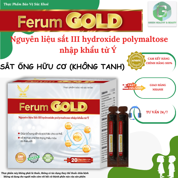 THỰC PHẨM BẢO VỆ SỨC KHỎE FERUM GOLD  Thành Phần :  Sắt III hydroxide polymaltose: 120 mg (Tương ứng sắt: 36mg), FOS (Fructose oligosaccharide): 50mg, Vitamin C: 5mg, Vitamin B6: 1mg, Vitamin B9 (Acid folic): 400mcg, Vitamin B12 (Cyanocobalamin):5mcg   Công dụng: Giúp bổ sung sắt và acid folic cho cơ thể, Hỗ trợ tạo hồng cầu và hạn chế tình trang thiếu máu do thiếu sắt. Cách dùng: Trẻ 1- 3 tuổi: Uống ½ ống/lần/ngày Trẻ trên 3 - 12 tuổi: Uống ½ - 1 ống/lần/ngày Trẻ trên 12 và người lớn: Uóng 1 ống/lần/ngày. Thực phẩm này không phải là thuốc, không có tác dụng thay thế thuốc chữa bệnh. không sử dụng cho người mẫn cảm với bất cứ thành phần nào của sản phẩm  Bạn nên uống sắt lúc sáng sớm sẽ có tác dụng tốt hơn, vì lúc này cơ thể vừa trải qua một giấc ngủ dài và khoảng thời gian này là lúc hàm lượng  trong cơ thể đang ở mức thấp nhất. Vì vậy, mỗi ngày uống sắt vào buổi sáng là điều được các chuyên gia khuyến khích. Sắt được hấp thu tốt nhất vào thời điểm bạn đang đói vì thức ăn sẽ làm giảm sự hấp thụ vi chất dinh dưỡng quan trọng này. Tốt nhất là bạn nên uống sắt trước hay sau bữa ăn sáng khoảng 30 phút.