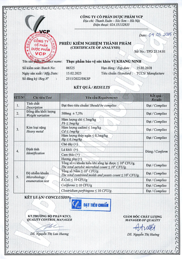 - Thông tin sản phẩm Loại sản phẩm: Dạng bào chế Quy cách: Hộp 3 vỉ x 10 viên; Hộp 1 lọ 60 viên Vị Khang Ninh là viên nang cứng Viên uống hỗ trợ bảo vệ dạ dày Vị Khang Ninh được sản xuất tại Công ty cổ phần Dược phẩm VCP, địa chỉ tại: địa chỉ Thạch Lỗi - Thanh Xuân - Sóc Sơn - Hà Nội.
