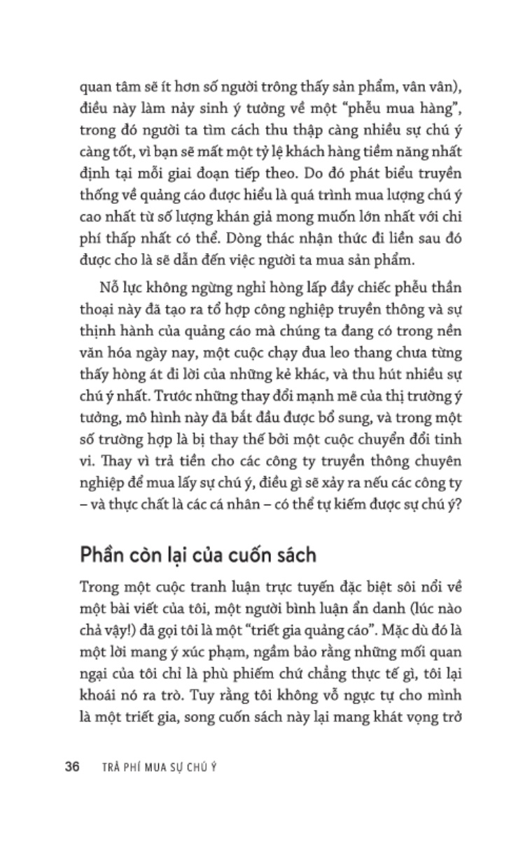 Trả phí mua sự chú ý khám phá cách những ý tưởng làm lay động tâm can con người, cũng như những thay đổi cần thiết trong quảng cáo để có thể theo kịp bối cảnh truyền thông hiện đại. Cuốn sách cũng bao gồm nhiều ví dụ thực tế từ các chiến dịch lớn của những công ty như S, Redbull và HP, cùng những công cụ và biểu mẫu marketing có tính ứng dụng cao .