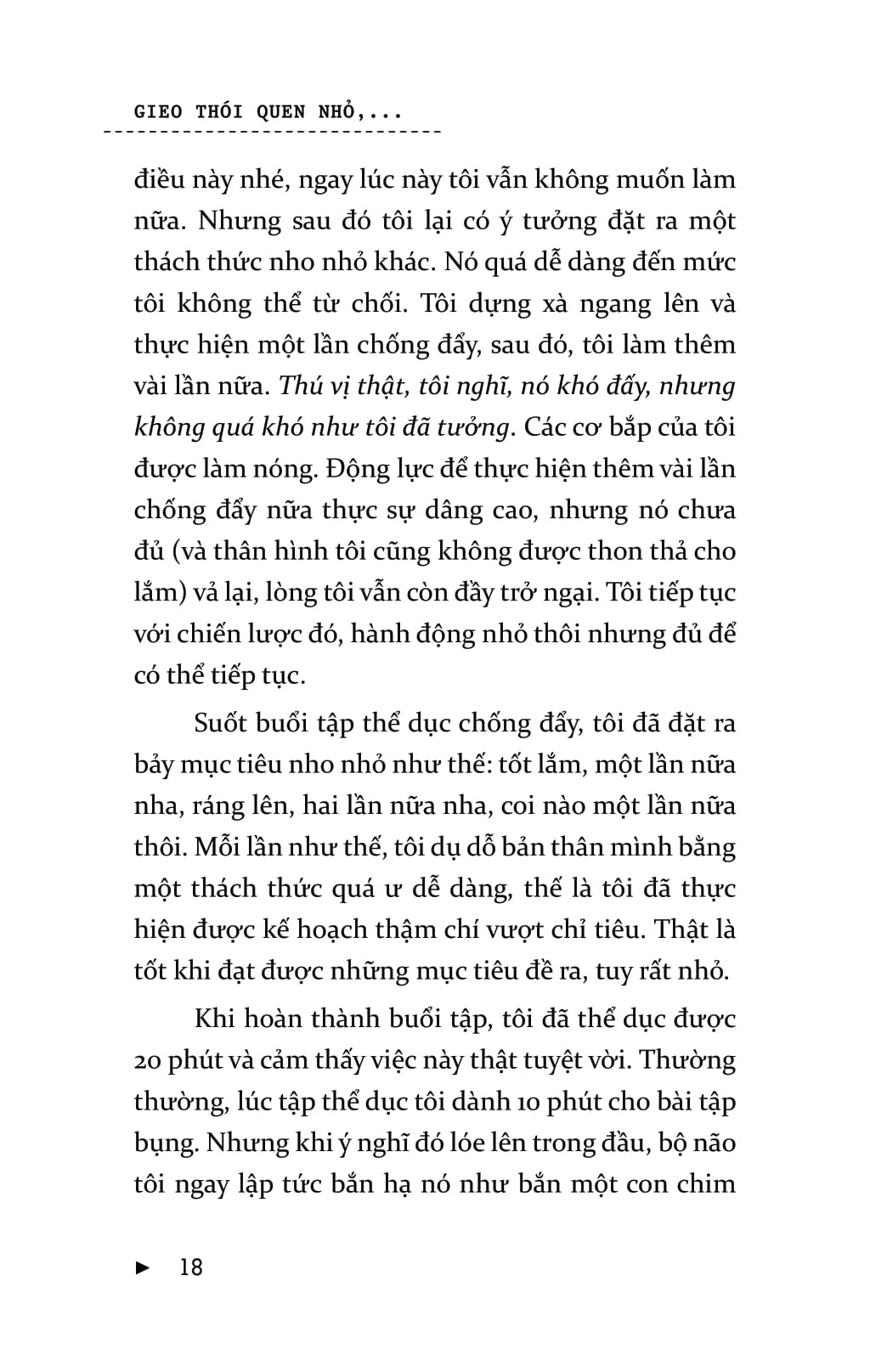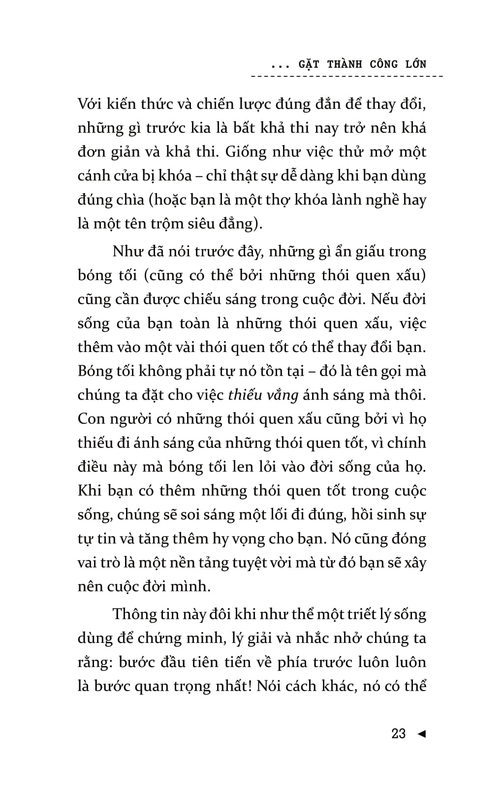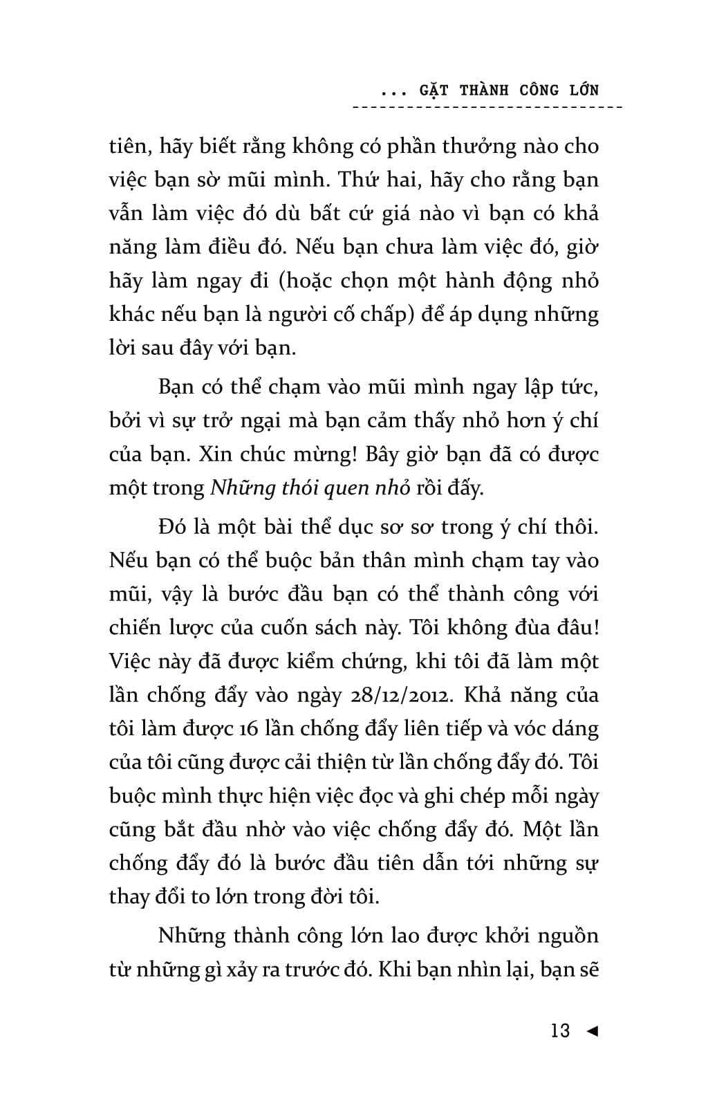 Mọi người thường nghĩ, chính họ là nguyên nhân khiến bản thân không thể đạt được sự thay đổi lâu dài. Nhưng vấn đề ở đây không phải là bản thân họ mà là chiến lược của họ. Bạn có thể đạt được những thành công to lớn mà không chịu bất cứ áp lực nào và sẽ không lặp lại thất bại nhờ những cách thức, phương pháp kiểu như: “lấy động lực”, sự kiên trì, và thậm chí là “làm đại đi”. Để đạt được những thay đổi lâu dài, bạn đừng cưỡng lại bộ não của mình. Khi bạn bắt đầu làm theo những chỉ thị của não bộ – theo dẫn dắt từ Gieo thói quen nhỏ gặt thành công lớn – thì những thay đổi tích cực, lâu dài sẽ không khó để đạt được! Gieo thói quen nhỏ gặt thành công lớn là cuốn sách khoa học tìm ra sự mâu thuẫn trong hầu hết các chiến lược phát triển bản thân và lý giải nguyên nhân tại sao các thói quen nhỏ lại tạo nên sự thống nhất rõ rệt. Một thói quen nhỏ là hành vi tích cực rất nhỏ mà bạn bắt bản thân phải làm mỗi ngày. Nó “quá nhỏ để thất bại” nhưng lại mạnh mẽ không thể lường trước và là một chiến lược góp phần hình thành nên thói quen ưu việt.Cuốn sách gồm có bảy phần chính. Ba phần đầu của cuốn sách bàn về việc xây dựng thói quen, bộ não, ý chí, động lực và chỉ ra cách chúng liên hệ với nhau. Hai phần tiếp theo bàn về các kết luận mang tính lô-gic và cách khai thác một cách khoa học nhất những thông tin cung cấp. Ba phần cuối hướng dẫn bạn áp dụng những cách thức đó trong cuộc sống.Chiến lược này sẽ giúp cuộc sống của bạn trở nên hoàn hảo hơn 99% số người sống trên hành tinh này.