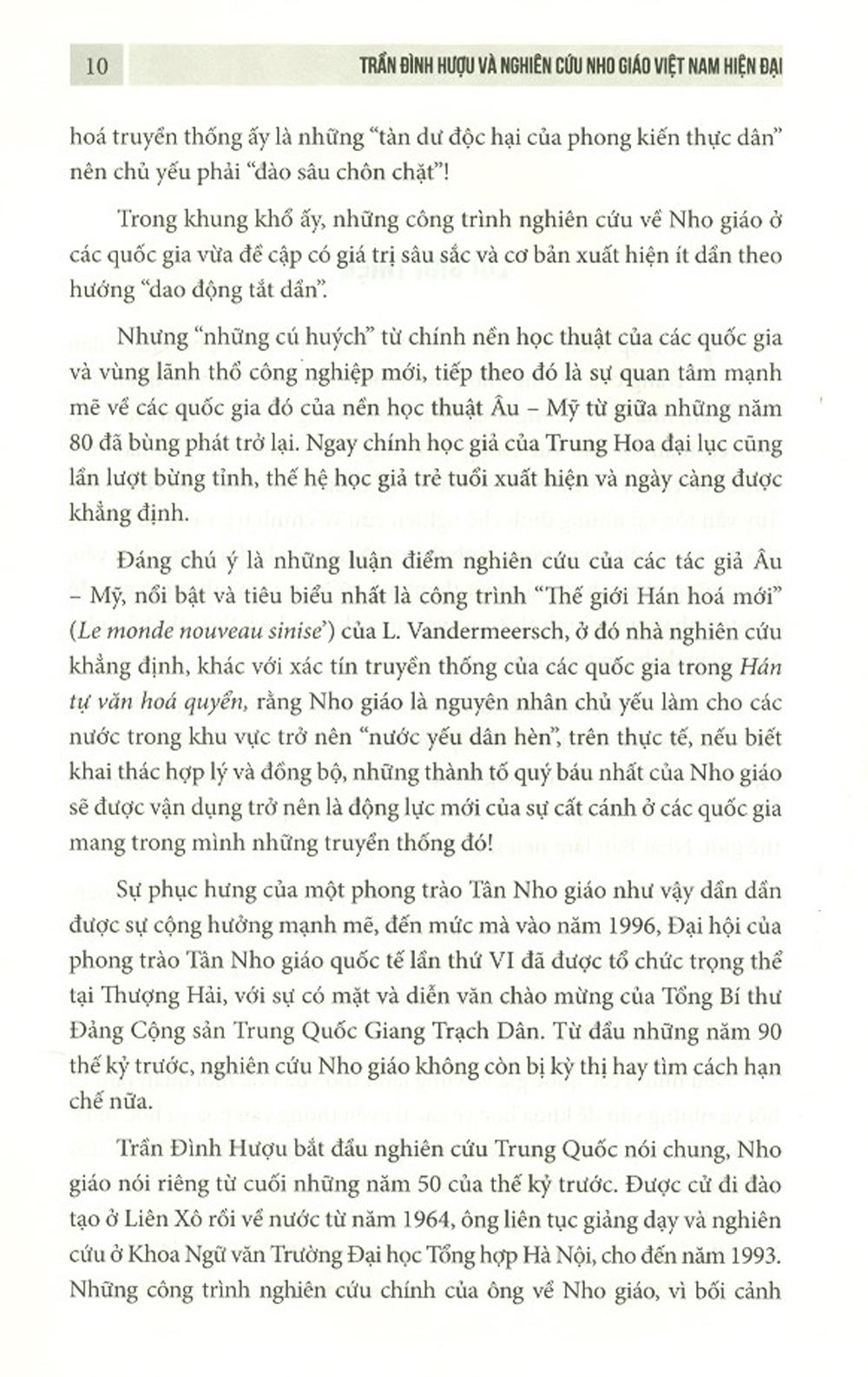 Sự phục hưng của một phong trào Tân Nho giáo như vậy dần dần được sự cộng hưởng mạnh mẽ, đến mức mà vào năm 1996, Đại hội của phong trào Tân Nho giáo quốc tế lần thứ VI đã được tổ chức trọng thể tại Thượng Hải, với sự có mặt và diễn văn chào mừng của Tổng Bí thư Đảng Cộng sản Trung Quốc Giang Trạch Dân. Từ đầu những năm 90 thế kỷ trước, nghiên cứu Nho giáo không còn bị kỳ thị hay tìm cách hạn chế nữa. | Trần Đình Hượu bắt đầu nghiên cứu Trung Quốc nói chung, Nho giáo nói riêng từ cuối những năm 50 của thế kỷ trước. Được cử đi đào tạo ở Liên Xô rồi về nước từ năm 1964, ông liên tục giảng dạy và nghiên cứu ở Khoa Ngữ văn Trường Đại học Tổng hợp Hà Nội, cho đến năm 1993. Những công trình nghiên cứu chính của ông về Nho giáo, vì bối cảnh