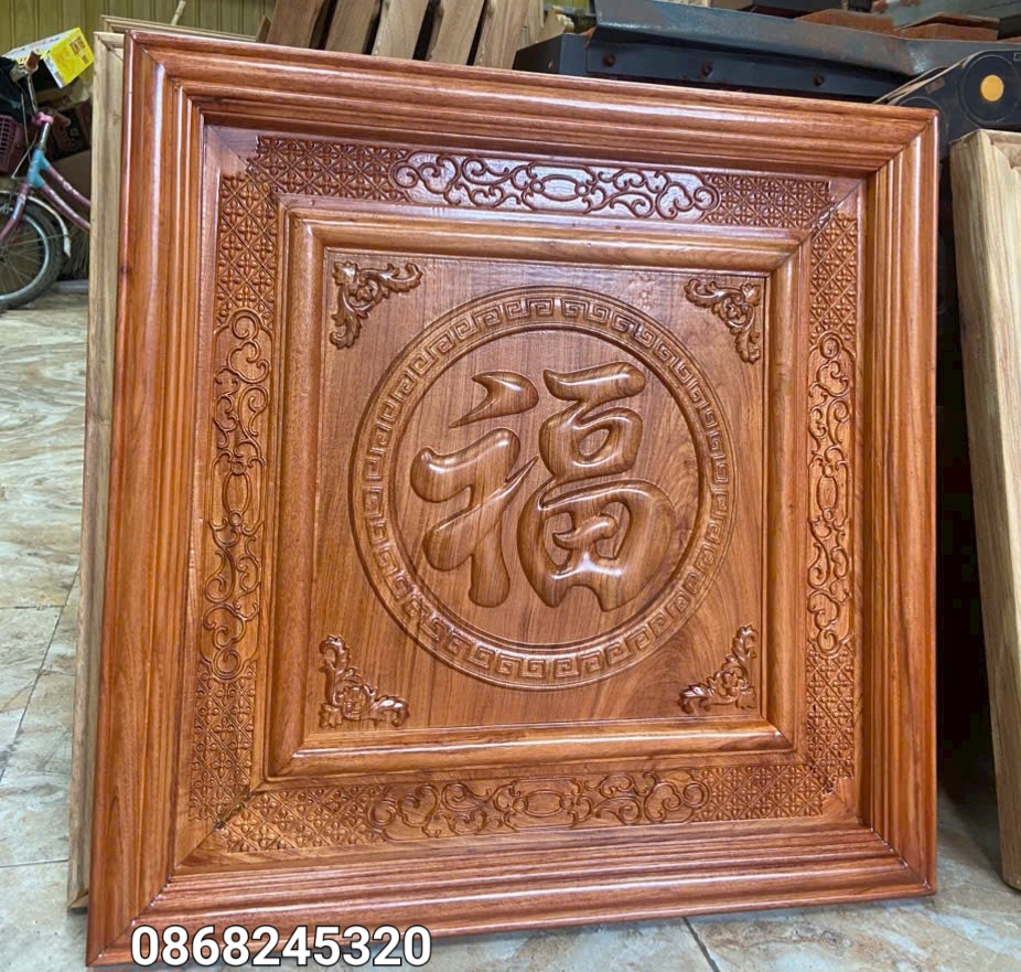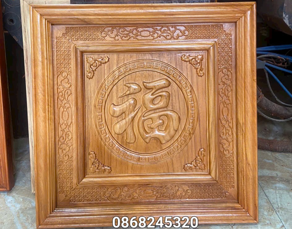 _ Tranh chữ phúc được làm bằng chất liệu gỗ gõ tự nhiên 100% _ Kt mặt vuông 61×61×4cm _ Tranh được khắc nổi tỉ mỉ ,tinh xảo kỳ công .Từ những người thợ giàu