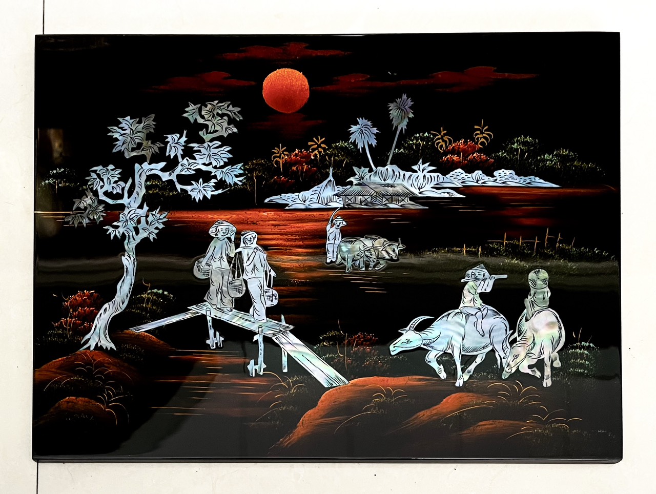Kích thước 40x60cm Chất Liệu gỗ MDF phủ Melamin có độ bền cao Tranh sơn mài cẩn ốc là tranh nghệ thuật thủ công truyền thống của Việt Nam khác biệt hẳn so với các