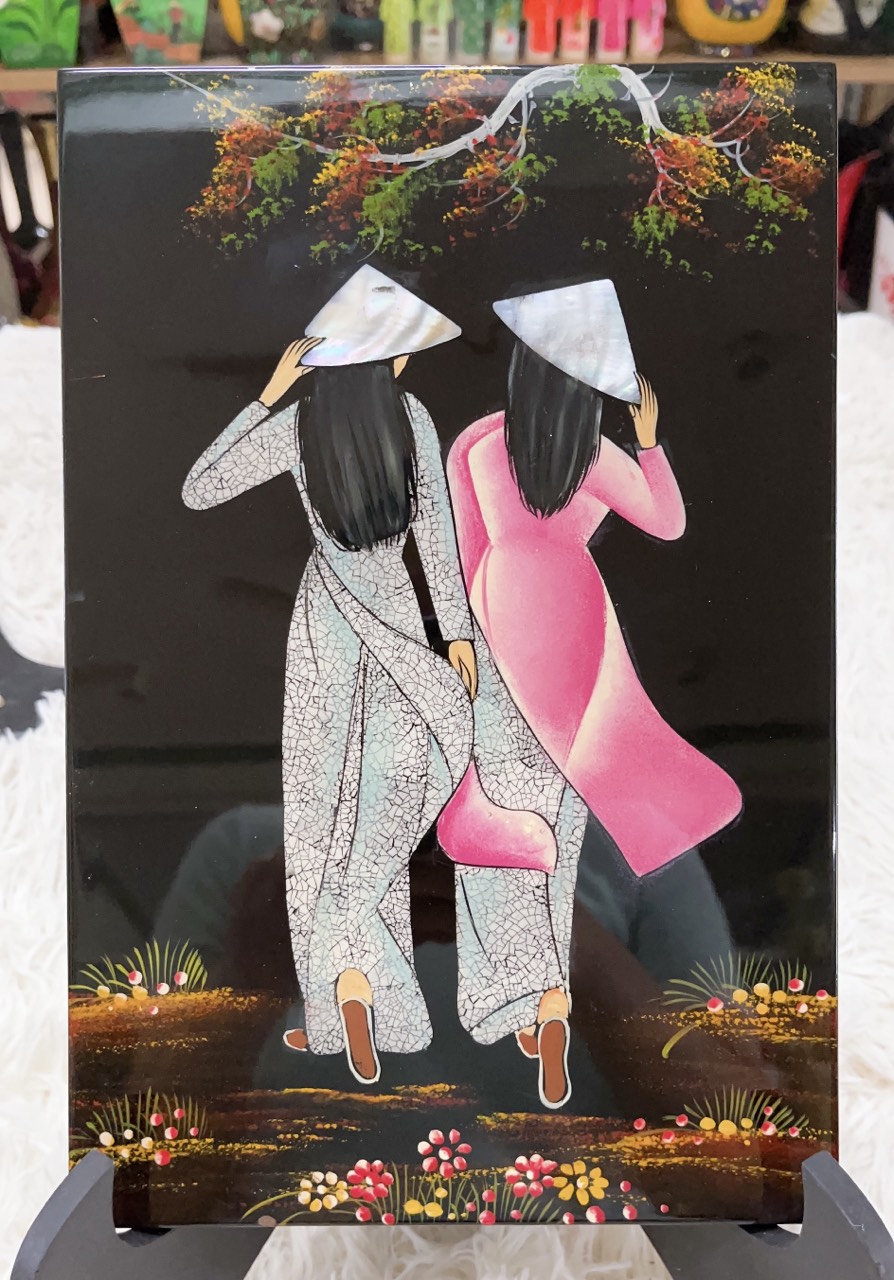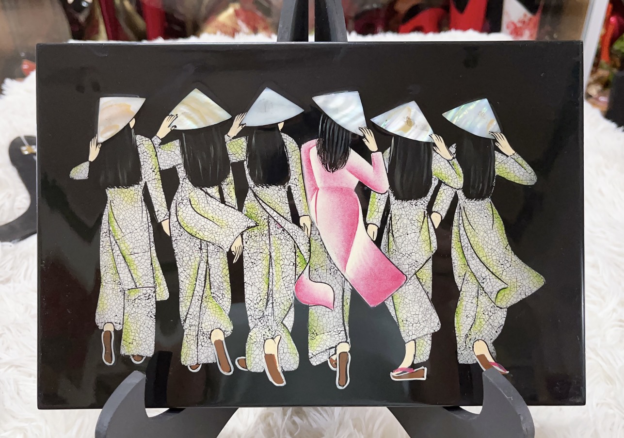 Tranh sơn mài cẩn vỏ trứng- cẩn chìm tặng khách nước ngoài là món quà tuyệt vời nhất, tà áo dài làm du khách liên tưởng đến những cô gái Việt Nam trong tà áo dài thướt tha, mềm mại như sự dịu dàng vốn có của con người hiền hòa nơi đây.