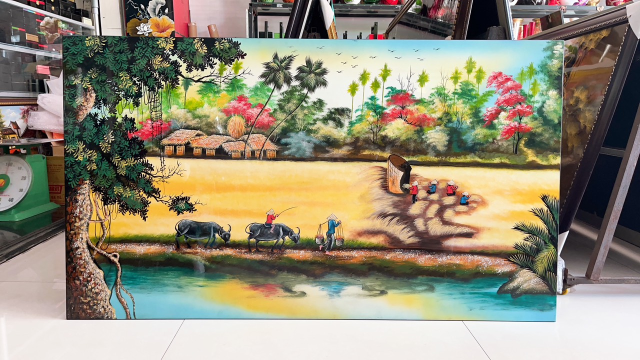 Các bức tranh phong cảnh làng quê Việt Nam với những hình ảnh quen thuộc như gốc đa giếng nước, cậu bé chăn trâu thổi sáo,…Những hình ảnh của làng quê vừa mộc mạc, giản dị lại vừa thể hiện vẻ đẹp thơ mộng, yên bình của làng quê Việt Nam. Những hình ảnh từ tranh làng quê này gợi nhớ cho chúng ta nỗi nhớ nhung mam mác về sự yên bình không thể phai nhòa trong tâm thức mỗi người dân Việt. Xã hội ngày càng hiện đại, những hình ảnh quen thuộc của phong cảnh làng quê Việt Nam dần được thay thể bởi những khu công nghiệp với những nhà máy, máy móc hiện đại,…khiến bạn không được ngắm những hình ảnh đẹp của quê hương thân thương ngày xưa nữa. Chính vì thế, bằng những nét vẽ tinh tế, các họa sĩ đã sáng tạo nên những bức tranh phong cảnh làng quê Việt Nam để giúp bạn có thể lại được thấy những hình ảnh thân thuộc của tuổi thơ.