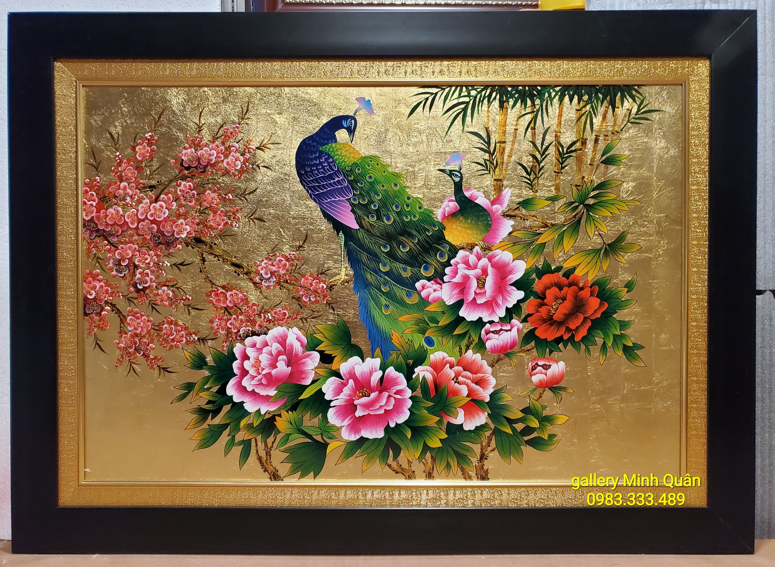 Tranh đôi chim công hoa mẫu đơn dát vàng 24k