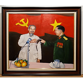 Tranh Vẽ sơn dầu Bác Hồ & Bác Giáp Tranh sơn dầu vẽ Đại tướng Võ Nguyên Giáp & Bác Hồ Chất liệu:Sơn dầu, vải toan, khung tranh màu vân gỗ composits cao cấp không