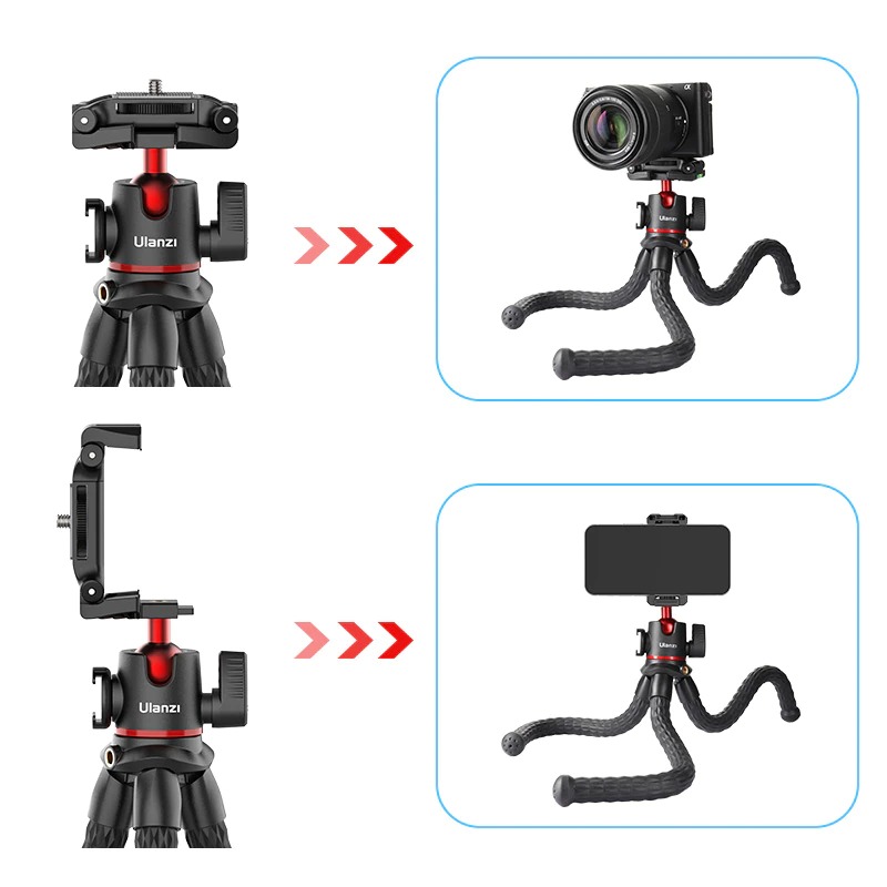 - Thiết kế 2 trong 1: giá đỡ phía trên vừa có thể lắp máy ảnh với vít 1/4" tiêu chuẩn vừa có thể mở rộng trở thành kẹp điện thoại tương thích với kích thước 60-85mm.