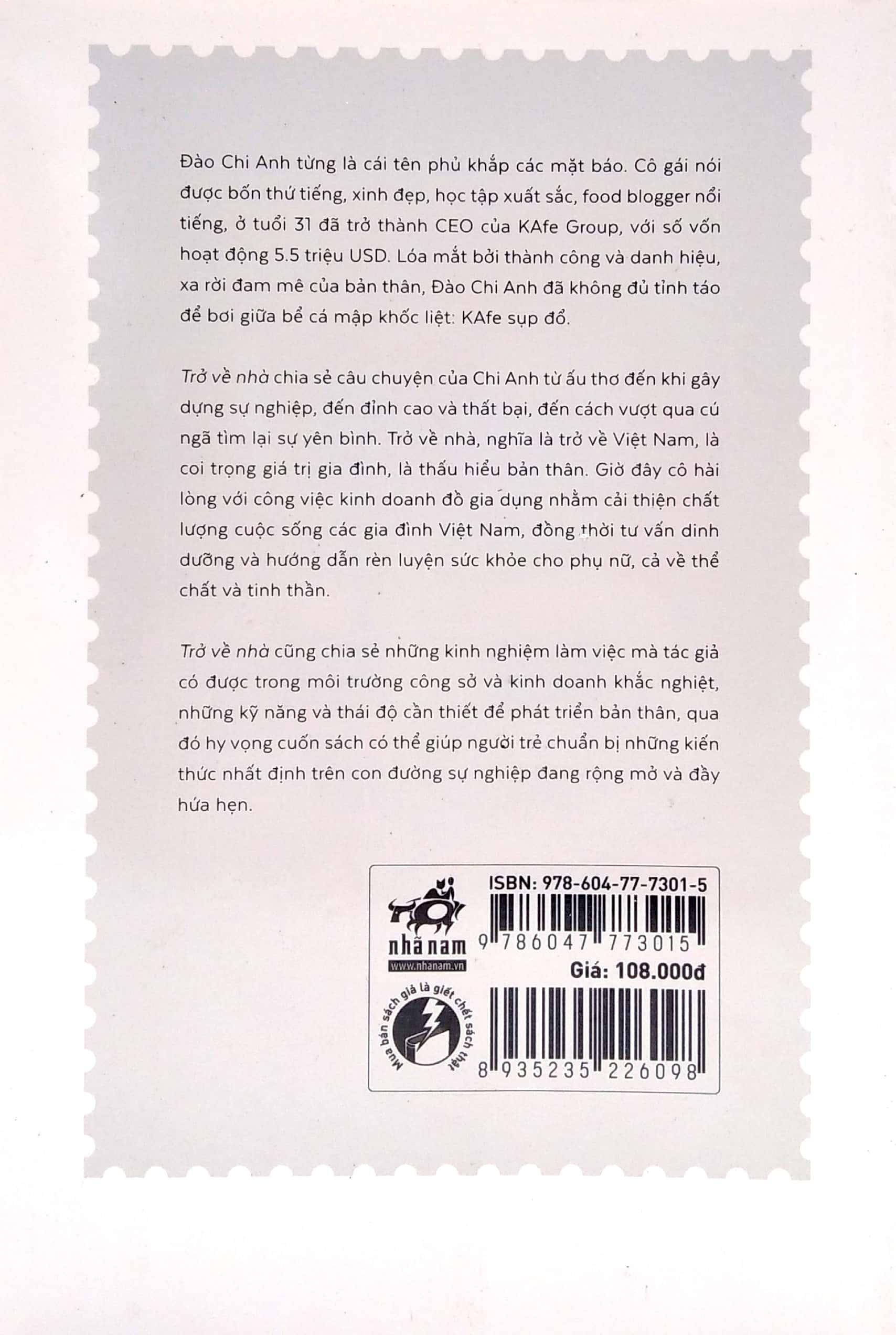 Tôi trở lại những việc đầu tiên đã mang tôi đến cuộc hành trình kinh doanh. Đó chính là tình yêu của tôi dành cho ẩm thực, nấu ăn và công việc sáng tạo. Tôi để trái tim dẫn đường và không quan trọng con đường ấy dẫn tôi đến đâu.” Đào Chi Anh từng là cái tên phủ khắp các mặt báo. Cô gái nói được bốn thứ tiếng, xinh đẹp, học tập xuất sắc, food blogger nổi tiếng, ở tuổi 31 đã trở thành CEO của KAfe Group,với số vốn hoạt động 5.5 triệu USD.Lóa mắt bởi thành công và danh hiệu, xa rời đam mê của bản thân, Đào Chi Anh đã không đủ tỉnh táo để bơi giữa bể cá mập khốc liệt: KAfe sụp đổ. Trở về nhà chia sẻ câu chuyện của Chi Anhtừ ấu thơ đến khi gây dựng sự nghiệp, đến đỉnh cao và thất bại, đến cách vượt qua cú ngã tìm lại sự yên bình. Trở về nhà, nghĩa là trở về Việt Nam, là coi trọng giá trị gia đình, là thấu hiểu bản thân. Giờ đây cô hài lòng với công việc kinh doanh đồ bếp, làm tư vấn cho các dự án ẩm thực, đồng thời tư vấn dinh dưỡng và rèn luyện sức khỏe cho phụ nữ. Trở về nhà cũng chia sẻ những kinh nghiệm làm