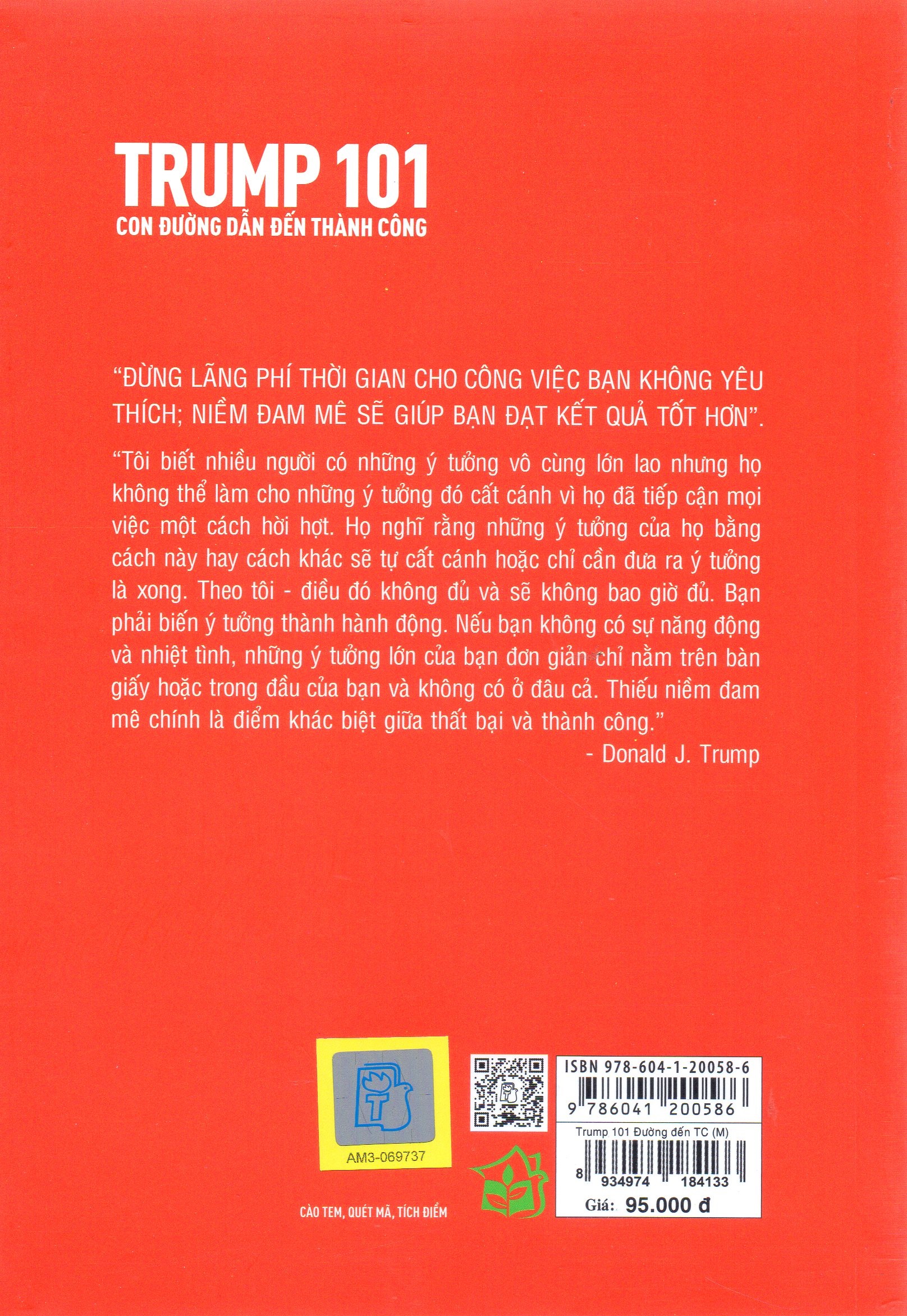Mua tại TiktokSách Trump 101 - Con đường dẫn đến thành công đỉnh cao Nhà xuất bản : Trẻ Nhà phát hành : Công Ty TNHH Văn Hóa Đông Tây Năm xuất bản : 2023 Tác giả : Donald J. Trump & Meredith Mc Iver Số trang : 239 Khổ : 14 x 20cm Trọng lượng : 500gr Bạn đã đọc Tôi đã làm giàu như thế, Đường đến thành công đỉnh cao, Nghĩ như một tỷ phú của Donald J. Trump thì không thể bỏ qua Trump 101, con đường dẫn đến thành công. Trong cuốn sách này với vai trò vừa là nhà tư vấn, vừa là bạn đồng hành, Donald J. Trump sẽ chia sẻ cùng bạn những bí quyết cũng như những chiến lược giúp bạn phát triển khả năng của mình một cách tốt nhất và có được những định hướng đúng đắn nhất trong nghề nghiệp cũng như trong cuộc sống.