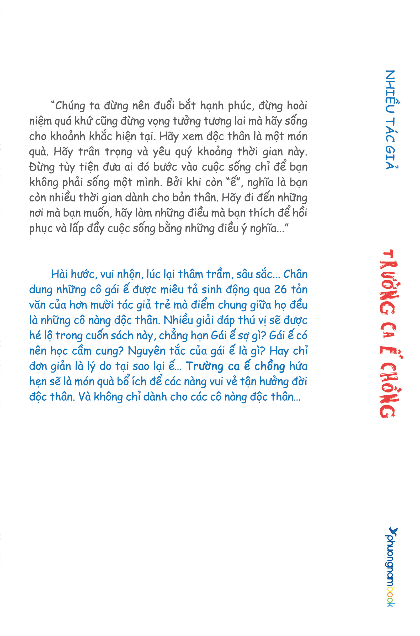 Hài hước, vui nhộn, lúc lại thâm trầm, sâu sắ Chân dung những cô gái ế được miêu tả sinh động qua 26 tản văn của hơn mười tác giả trẻ mà điểm chung giữa họ đều là những cô nàng độc thân. Nhiều giải đáp thú vị sẽ được hé lộ trong cuốn sách này, chẳng hạn Gái ế sợ gì? Gái ế có nên học cầm cung? Nguyên tắc của gái ế là gì? Hay chỉ đơn giản là lý do tại sao lại ế Trường Ca Ế Chồng hứa hẹn sẽ là món quà bổ ích để các nàng vui vẻ tận hưởng đời độc thân. Và không chỉ dành cho các cô nàng độc thâ