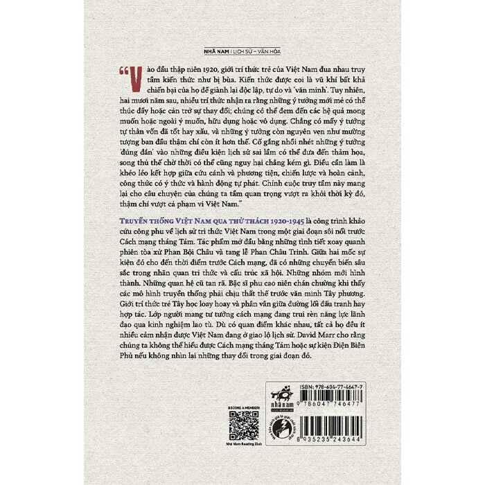 TRUYỀN THỐNG VIỆT NAM QUA THỬ THÁCH 1920-1945 là công trình khảo cứu công phu về lịch sử tri thức Việt Nam trong một giai đoạn sôi nổi trước Cách mạng tháng Tám. Tác phẩm mở đầu bằng những tình tiết xoay quanh phiên tòa xử Phan Bội Châu và tang lễ Phan Châu Trinh. Giữa hai mốc sự kiện đó cho đến thời điểm trước Cách mạng, đã có những chuyển biến sâu sắc trong nhãn quan tri thức và cấu trúc xã hội. Những nhóm mới hình thành. Những quan hệ cũ tan rã. Bậc sĩ phu cao niên chán chường khi thấy các mô hình truyền thống phải chịu thất thế trước văn minh Tây phương. Giới trí thức trẻ Tây học loay hoay và phân vân giữa đường lối đấu tranh hay hợp tác. Lớp người mang tư tưởng cách mạng đang trui rèn năng lực lãnh đạo qua kinh nghiệm lao tù. Dù có quan điểm khác nhau, tất cả họ đều ít nhiều cảm nhận được Việt Nam đang ở giao lộ lịch sử. David Marr cho rằng chúng ta không thể hiểu được Cách mạng tháng Tám hoặc sự kiện Điện Biên Phủ nếu không nhìn lại những thay đổi trong giai đoạn đó.