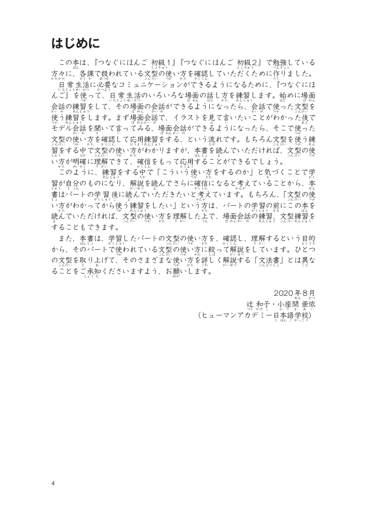 Giáo trình được biên soạn nhằm giúp người học giao tiếp bằng tiếng Nhật tốt hơn trong các hoạt động xã hội. Các tình huống học tập trong giáo trình là những tình huống thường được sử dụng để giao tiếp trên thực tế, được lựa chọn từ các lĩnh vực trong đời sống sinh hoạt, trường học và xã hội. Cách học được tổ chức theo hình thức đặc biệt ưu tiên việc "Giao tiếp" hơn là "Hiểu" từ vựng và ngữ pháp. [Hội thoại tình huống -> Xác nhận mẫu câu -> Luyện tập mẫu câu -> Hội thoại ứng dụng] Giáo trình bao gồm 2 sách giáo khoa sơ cấp 1, 2, hai quyển Work book sơ cấp 1,2 và 1 quyển Bản dịch và giải thích ngữ pháp.