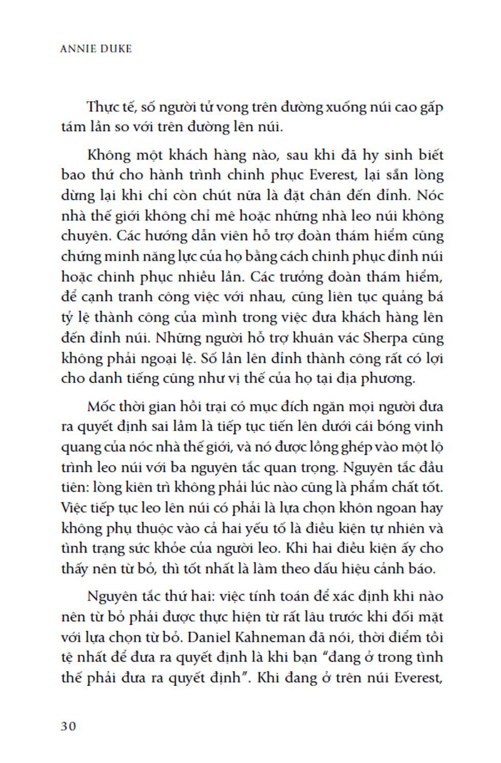 Xuyên suốt mười một chương sách, Annie Duke đ.ã sử dụng những bằng chứng khoa học, những trường hợp điển hình và những phân tích thấu đáo để chỉ ra những sự thật về quyết định từ bỏ. Trong khi kiên trì là một phẩm chất không thể thiếu để đạt đến thành công, thì mặt trái của nó là có thể khiến chúng ta sa lầy vào những nỗ lực không còn xứng đáng. Không ít cá nhân có tên tuổi đã phạm phải sai lầm này và đánh mất cả danh tiếng lẫn cơ hội phát triển. Nhiều doanh nghiệp lớn như Sears, Blockbuster hay chuỗi cửa hàng giảm giá ABC đã tiêu tốn hàng triệu đô-la cố duy trì một mô hình hoặc quy trình đã không còn hoạt động hiệu quả, rốt cuộc dẫn tới kết quả vô cùng đáng tiếc. Chúng ta có tâm lý muốn tiếp tục dồn sức cho một nỗ lực m.ình đã đầu tư quá nhiều mà không nhận ra rằng khi kiên trì với một nỗ lực không còn xứng đáng là ta đang lãng phí thời gian, tiền bạc và năng lượng – những thứ mà lẽ ra ta có thể sử dụng cho một mục tiêu tốt hơn.
