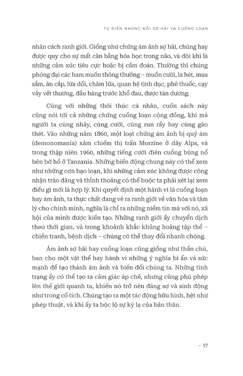 Từ điển những nỗi sợ hãi và cuồng loạn của tác giả Kate Summerscale đưa chúng ta vào hành trình tìm hiểu nguồn gốc, cơ chế tâm lý của những nỗi ám ảnh, góp phần khai quật lịch sử về sự kỳ lạ của con người từ thời trung cổ cho đến ngày nay, đồng thời đưa ra lời giải thích và một số phương pháp điều trị tích cực, hiệu quả cho những nỗi sợ hãi và cuồng loạn mạnh mẽ nhất.