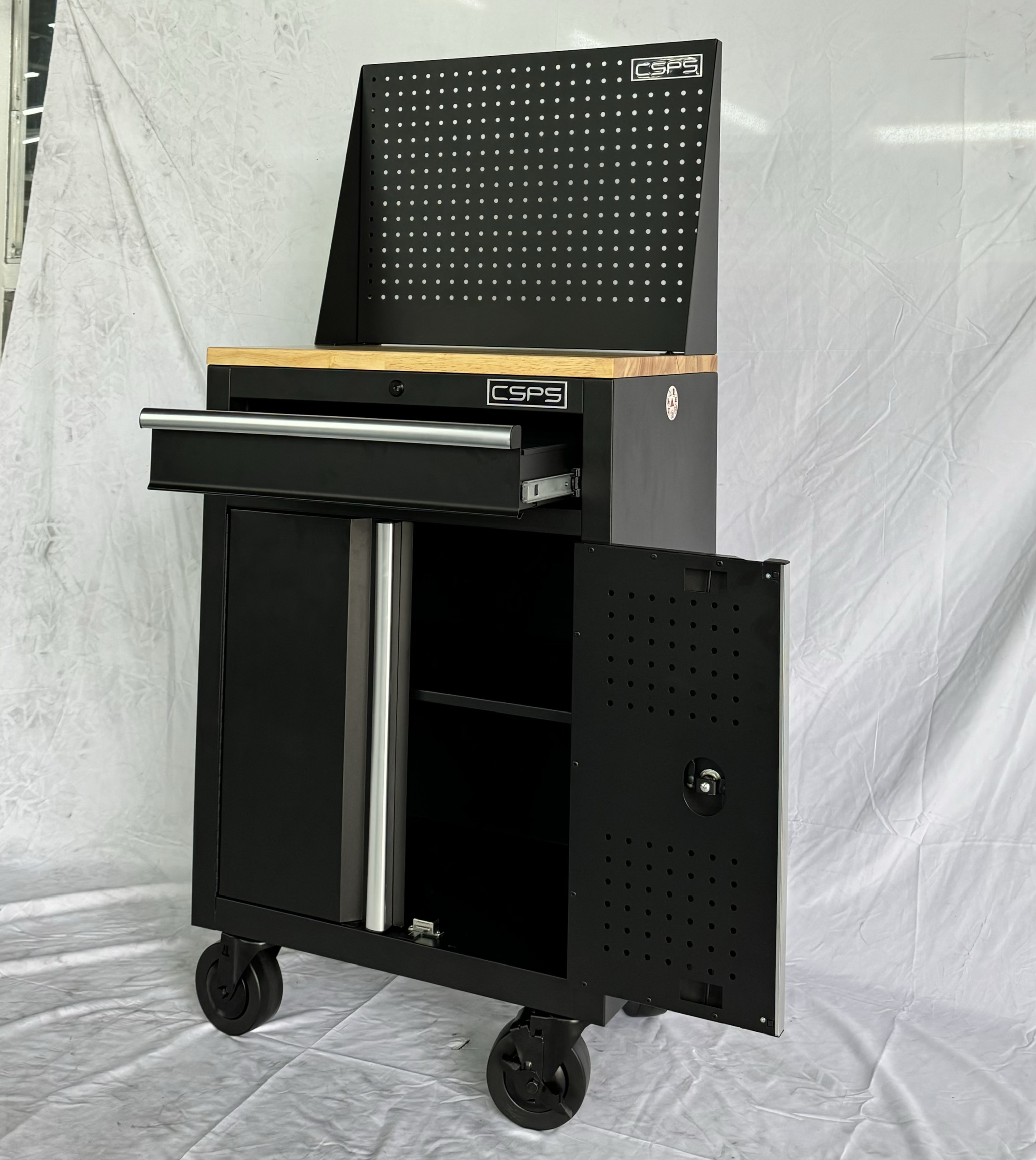 Tủ dụng cụ CSPS 61cm - 01 hộc kéo màu đen bánh xe ván gỗ vách lưới (tay cầm trắng)