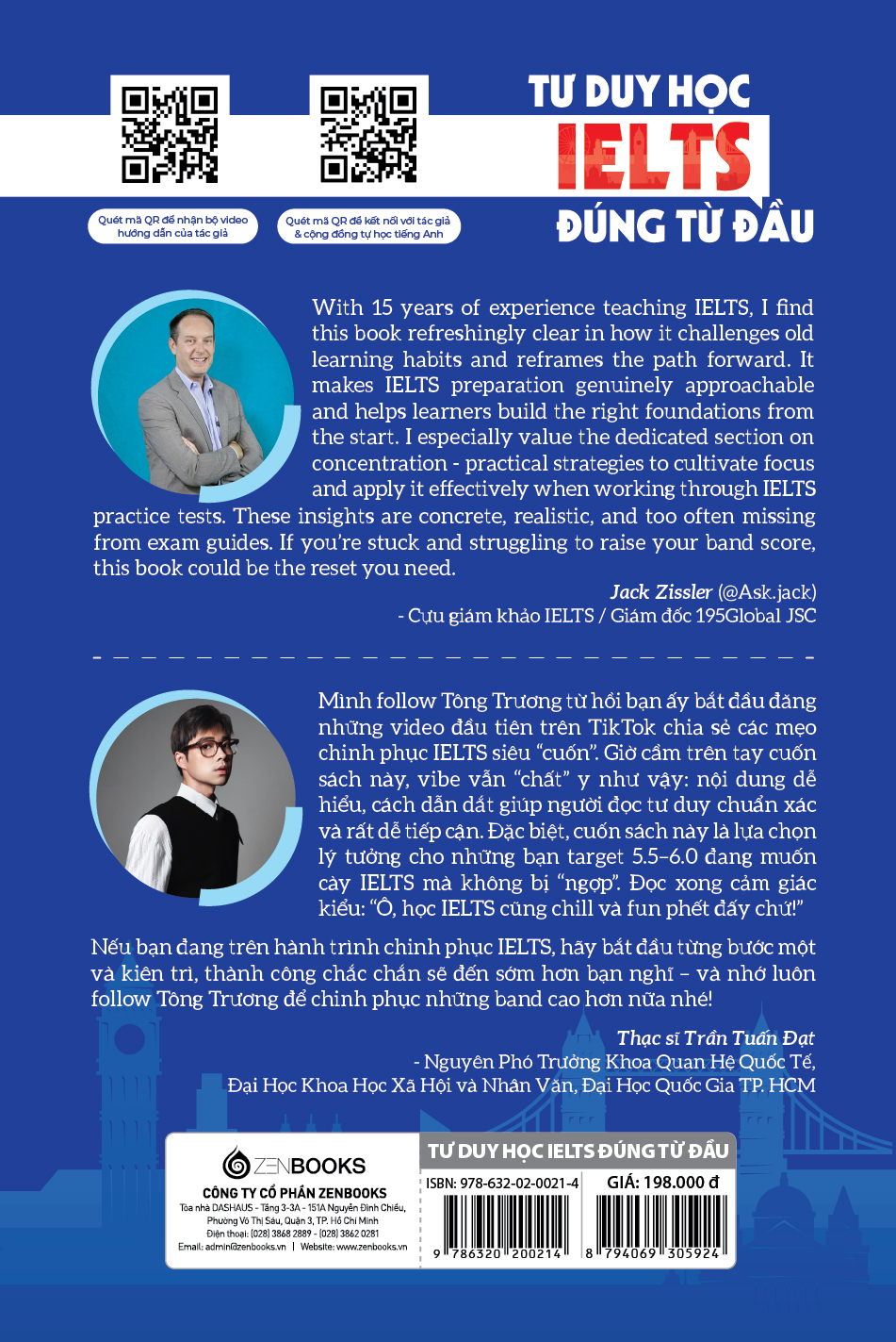 - Cẩm nang hướng dẫn các phương pháp học hiệu quả Tương tự như xây một ngôi nhà, nếu nền móng không vững thì tòa nhà sau khi hoàn thành cũng sẽ rất dễ đổ sụp. Đó là lý do mà nền móng luôn là giai đoạn được ưu tiên và cũng là phần tốn nhiều thời gian nhất. Học IELTS cũng giống như vậy. Nếu từ ban đầu người học không đầu tư cho nền móng, hay nói chính xác hơn là không có phương pháp học đúng chuẩn và hiệu quả, thì giai đoạn về sau sẽ cực kỳ chông gai và khiến bạn dễ dàng bỏ cuộc. Với người mới bắt đầu học IELTS và chưa có cho mình bất kỳ ý tưởng nào về IELTS, như chứng chỉ ngoại ngữ IELTS là gì, dùng vào những mục đích nào, đối tượng nào nên học, hay người chưa biết bắt đầu từ đâu hay đang mông lung trong quá trình học, thì “Tư Duy Học IELTS Đúng Từ Đầu” sẽ là một gợi ý đáng tham khảo. • Hướng dẫn toàn diện 4 kỹ năng IELTS: Listening - Reading - Writing - Speaking, thông qua phương pháp thực tế, dễ áp dụng. • Tư duy học đúng từ đầu: Giúp bạn phản xạ tiếng Anh tự nhiên, không cần dịch trong đầu. • Khắc phục lỗi học sai lầm thường gặp: Vì sao band mãi không tăng, vì sao dùng từ vựng “ngầu” mà vẫn sai? • Kỹ thuật độc quyền: “Tư duy ngược” trong IELTS Reading, “PEEL” cho Writing Task 2, “Chunking” để xử lý số liệu nhanh. • Chương Bonus đặc biệt: Hướng dẫn cách tập trung hiệu quả - một kỹ năng then chốt thường bị bỏ qua. “Tư Duy Học IELTS Đúng Từ Đầu” gồm 6 chương chính và 1 chương bonus. Xuyên suốt quyển sách là những phương pháp định hướng cách học IELTS, cũng như loạt bí quyết làm bài dàn trải đều cho cả 4 kỹ năng IELTS. • Chương 1: Think Like a Native Speaker - Tập tư duy như người bản xứ để nói tự nhiên, không dịch word-by-word. • Chương 2: Tư duy ngược trong IELTS Reading - Biết cách nghĩ ngược để không rơi vào bẫy đề. • Chương 3: Tư duy Gốc (Root-based Thinking) - Cách học từ vựng hiệu quả và ứng dụng vào Writing. • Chương 4: Chững band - Vì sao mãi không tăng? - Giải mã nguyên nhân và cách vượt qua. • Chương 5: Overcompensation - Tại sao “gồng mình” mà vẫn sai? Bỏ thói quen học quá sức nhưng thiếu đúng hướng. • Chương 6: PEEL - Viết Writing Task 2 đúng từ đầu - Công thức viết logic, dễ áp dụng. • Chương đặc biệt: Tập trung như thế nào mới hiệu quả? - Giải pháp rèn luyện sự tập trung trong học tập và làm bài. Sau cuốn sách này, bạn đọc sẽ được tiếp cận đến nhiều phương pháp hiệu quả, khiến cho việc học IELTS trở nên dễ dàng và thú vị hơn. “Tư Duy Học IELTS Đúng Từ Đầu” không chỉ là một tập tài liệu khô khan với lý thuyết, bài tập và lời giải, mà cuốn sách còn chứa đựng nhiều góc nhìn mới từ hai tác giả, khiến cho nội dung trở nên trực quan và sinh động hơn bao giờ hết. Cuốn sách này phù hợp với: ● Học sinh, sinh viên, người đi làm đã học tiếng anh và đang tìm hiểu IELTS ● Các bạn đã và đang luyện IELTS nhưng gặp trường hợp chững band ở tầm cơ bản đến 7.0 ● Các bạn muốn nâng band IELTS nhưng gặp khó khăn trong việc nâng điểm vì thiếu tư duy đúng và phương pháp học phù hợp. Về tác giả: Trương Kỳ Tông, hay còn được biết đến rộng rãi trong cộng đồng học IELTS với biệt danh “Không Phải Là Bác Sĩ”, gây ấn tượng mạnh bởi loạt thành tích khủng: cựu học sinh Chuyên Trần Đại Nghĩa, tốt nghiệp THPT Grand Prairie Collegiate Institute (Mỹ) vào năm 16 tuổi, đạt số điểm gần như tuyệt đối trong kỳ thi IELTS với band 8.5, đối tác chính thức của Hội đồng Anh, sở hữu 5 năm giảng dạy IELTS cho người mới và trung cấp. Trong lần ra mắt này, Kỳ Tông kết hợp cùng tác giả Võ Thái Thảo Nhi - cựu học sinh Chuyên Lê Hồng Phong, để biên soạn nên cuốn sách “Tư Duy Học IELTS Đúng Từ Đầu”. Thảo Nhi cũng là đồng sáng lập Nhà IELTS cùng Kỳ Tông, với loạt thành tích có thể kế đến như IELTS 8.0, 4 năm kinh nghiệm dạy tiếng Anh, cử nhân khoa Khoa học máy tính, ngành phụ Toán Ứng dụng trường ĐH Fulbright Vietnam. Đánh giá từ chuyên gia: Nếu biết đến Tư duy học IELTS đúng từ đầu sớm hơn, chắc chắn ngày xưa mình đã cải thiện điểm nhanh hơn từ mức 4.0. Cuốn sách chỉ ra những thói quen sai phổ biến và đưa ra cách tiếp cận tiếng Anh tự nhiên như người bản xứ. Đây là điều không dễ làm được nếu chỉ học theo cách thông thường, nhưng sách đã giúp người học từng bước sửa những "tật khó bỏ" đó. Với sự thực tế và hài hước, cuốn sách khiến việc luyện IELTS trở nên dễ tiếp cận và bớt áp lực hơn nhiều. - Bùi Thành Việt - IELTS 8.5, tác giả bộ sách IELTS WRITING JOURNEY With 15 years of experience teaching IELTS, I find this book refreshingly clear in how it challenges old learning habits and reframes the path forward. It makes IELTS preparation genuinely approachable and helps learners build the right foundations from the start. I especially value the dedicated section on concentration - practical strategies to cultivate focus and apply it e
