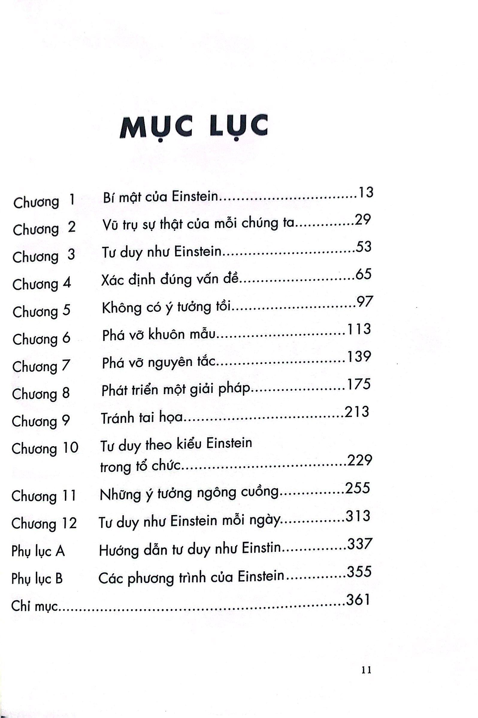 Tư duy như Einstein – cuốn sách phát triển tư duy mở ra những giải pháp đột phá để đối mặt, giải quyết mọi thách thức trong học tập, công việc, cuộc sống, các mối quan hệ, để không ngừng sáng tạo và phát triển mỗi ngày. Không phải ai cũng là thiên tài, nhưng chúng ta hoàn toàn có thể có lối tư duy của một thiên tài. Chúng ta không nhất thiết phải là nhà khoa học, không nhất thiết phải là chính trị gia hay doanh nhân lớn mới cần có đầu óc tổ chức và khả năng giải quyết vấn đề. Mỗi người đều có những vấn đề riêng cần giải quyết. Chỉ cần có phương pháp, ai cũng có thể tận dụng tối đa sự kỳ diệu của bộ óc con người, giống như Einstein đã sử dụng bộ óc siêu việt của mình để thay đổi thế giới. Và cuốn sách Tư duy như Einstein sẽ giúp bạn làm được điều đó. Tư duy như Einstein không nói về tài năng của Einstein, mà tìm cách vận dụng những lối tư duy của ông để rút ra các phương pháp tư duy đúng đắn và hiệu quả cho tất cả mọi người. Tác giả Scott Thorpe tỏ ra là người rất am hiểu về Einstein và nhiều lĩnh vực. Bằng những ví dụ cụ thể, tiêu biểu và dễ nắm bắt, ông chứng minh những vấn đề trừu tượng như cách phá vỡ mọi khuôn mẫu, nguyên tắc, tìm ý tưởng, lắng nghe bản thân, tưởng tượng mình là người khác hay sử dụng những ký hiệu, ngôn từ mới để thể hiện ý tưởng. Cuốn sách gồm 11 chương và hai phụ lục, hai chương đầu giới thiệu khái quát về Einstein và cách tư duy của ông, các chương tiếp theo đưa ra những bước đơn giản nhằm “phá vỡ nguyên tắc và khám phá khả năng thiên tài tiềm ẩn trong bạn”. Mỗi chương là một bước khám phá thông qua nhiều phương pháp và những ví dụ từ kinh điển đến thực tế giản đơn. Tư duy như Einstein là một câu chuyện, trong đó tác giả dẫn người đọc đi qua từng chặng đường với những bài thực hành độc đáo, giản dị đến mức khó tin, nhưng lại phản ánh cả một triết lý sâu sắc. Với rất nhiều loại công cụ đơn giản, bạn có thể thực hành các bài tập, nhưng quan trọng nhất vẫn là biết vận dụng chúng vào thực tế cuộc sống. Hãy nghĩ đến kết quả trước khi hành động, suy nghĩ tích cực, loại bỏ khó khăn và cản trở đến từ chính bản thân mình, thực thi những giải pháp tưởng như bất khả thi. Học cách tư duy của Einstein chính là học cách phá vỡ các nguyên tắc. Tác giả đã chứng minh rằng mọi nguyên tắc đều có thể bị phá vỡ và mục đích của việc phá vỡ nguyên tắc là để tìm ra giải pháp tối ưu. Tuy nhiên, không phải tất cả những cái mới đều hay và phù hợp, có những điều chúng ta không nên thay đổi. Từ cổ chí kim, mọi cuộc cách mạng, mọi sự thay đổi đều gian nan. Thế giới thực tại thường vận hành không như ý muốn của con người. Các sáng kiến có thể gây nguy hiểm cho người nghĩ ra chúng vì lòng tham, sự ích kỷ hoặc vì lối mòn tư duy của con người. Do đó, để có được cái mới, cái hay và cái đúng, chúng ta không những cần có phương pháp mà còn phải tỉnh táo, khéo léo để vượt qua và tránh những tai họa mà những người sáng tạo thường gặp phải. Chương 9 dành tặng độc giả những bài học tránh tai họa để thẳng tiến trên con đường phá vỡ nguyên tắc của mình. Tất cả mọi thứ đều có thể đưa đến giải pháp, hãy chú ý quan sát và lắng nghe, thậm chí lắng nghe cả kẻ thù của bạn. Đó không phải là một phép màu hay một truyện cổ tích, đó đơn giản là một phương pháp tư duy và giải quyết vấn đề.