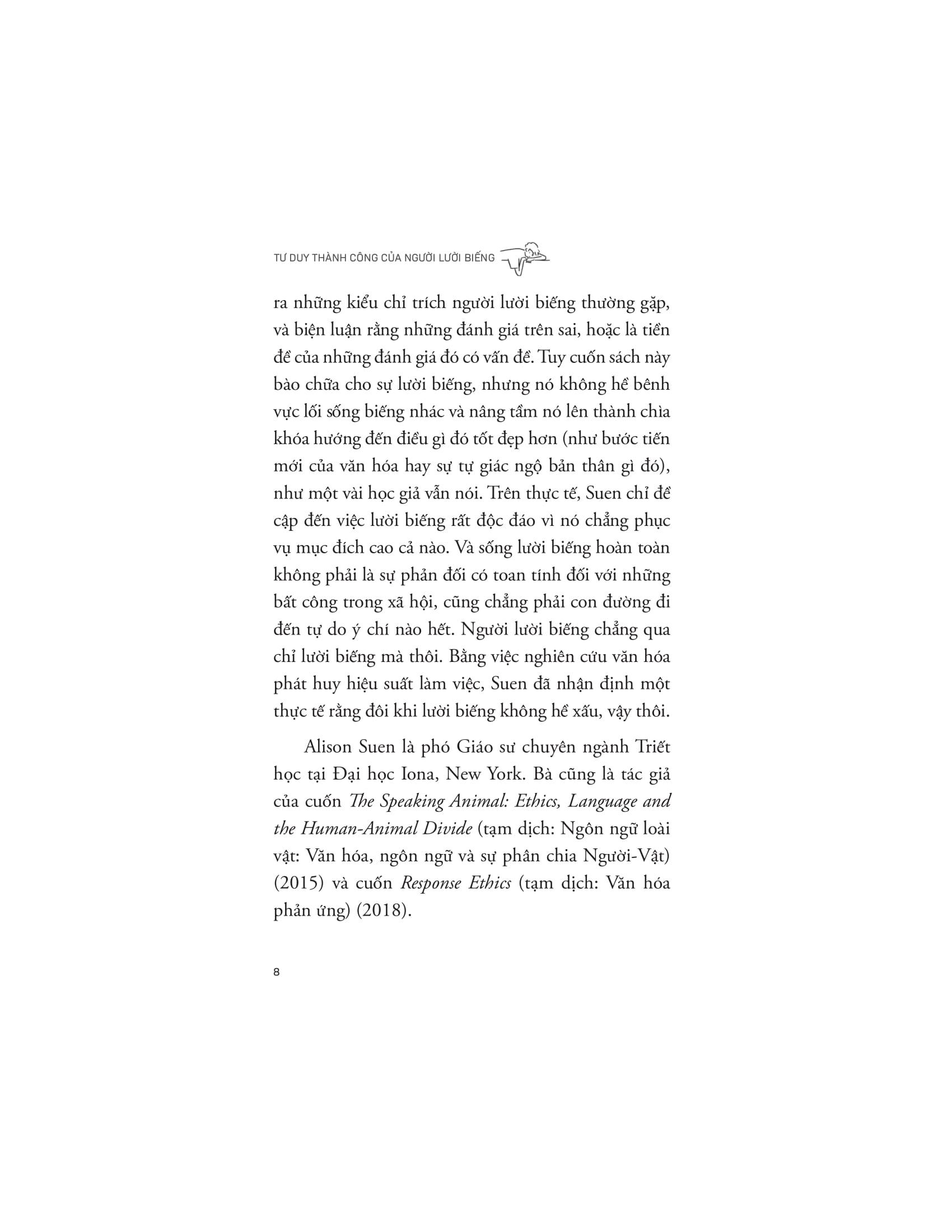 Tuy cuốn sách này bào chữa cho sự lười biếng, nhưng nó không hề bênh vực lối sống lười biếng. Bằng việc nghiên cứu văn hóa phát huy hiệu suất làm việc, Suen đã nhận định một thực tế rằng đôi khi lười biếng không hề xấu, họ là những người có tư duy khác biệt và thách thức các quan niệm thường thấy về thành công.