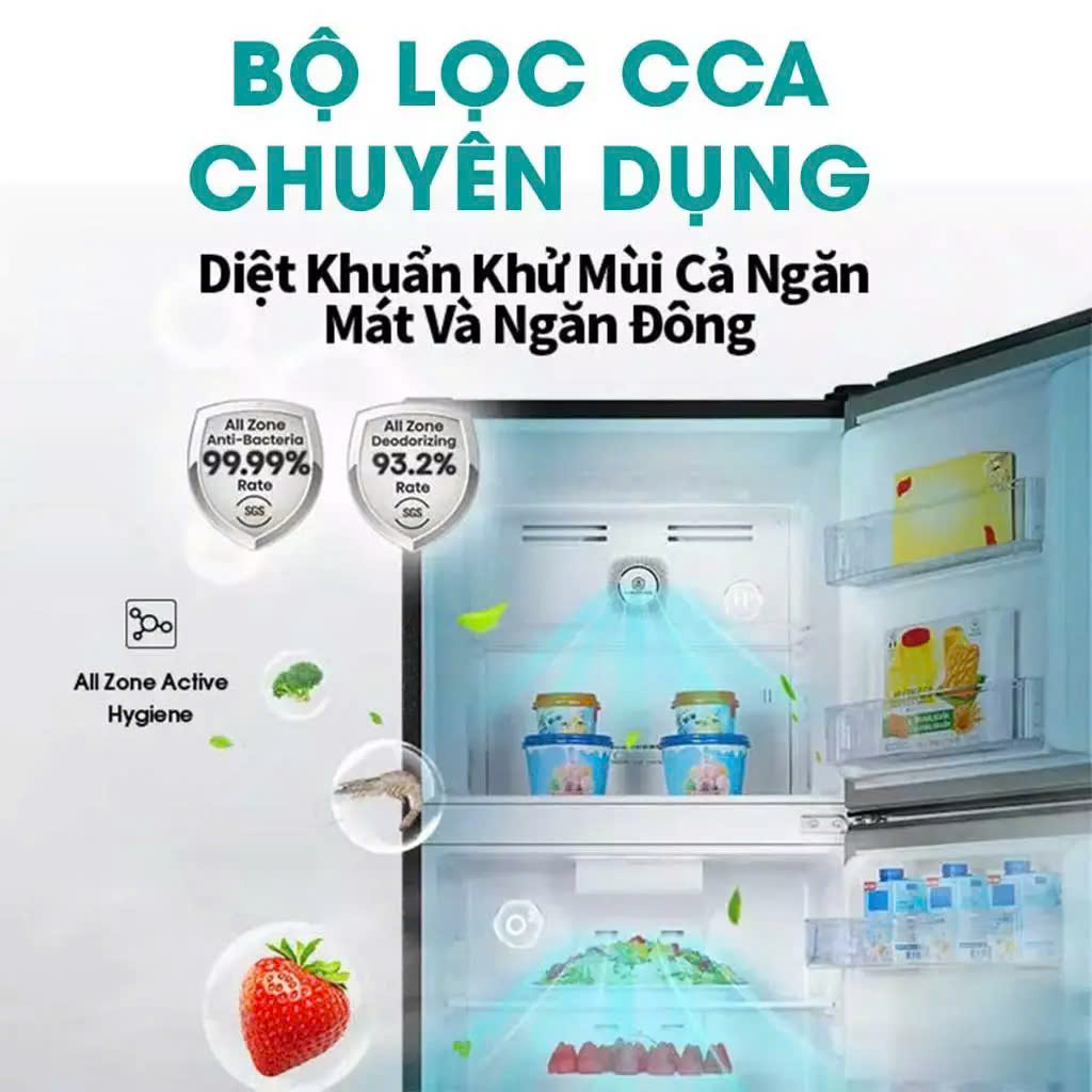 - Diệt khuẩn và khử mùi toàn diện: Ngăn Mát và Ngăn Đông được trang bị bộ lọc CCA chuyên dụng được thiết kế cho điều kiện nhiệt độ thấp, đảm bảo đạt được hiệu quả diệt khuẩn lên tới 99,99% và khử mùi lên tới 93,2%, bảo vệ cho sức khỏe gia đình. Các phân tử nước được tạo ra duy trì độ ẩm của rau và trái cây đồng thời giảm lượng khí Ethylene, kéo dài độ tươi của rau quả bằng cách làm chậm quá trình chín.