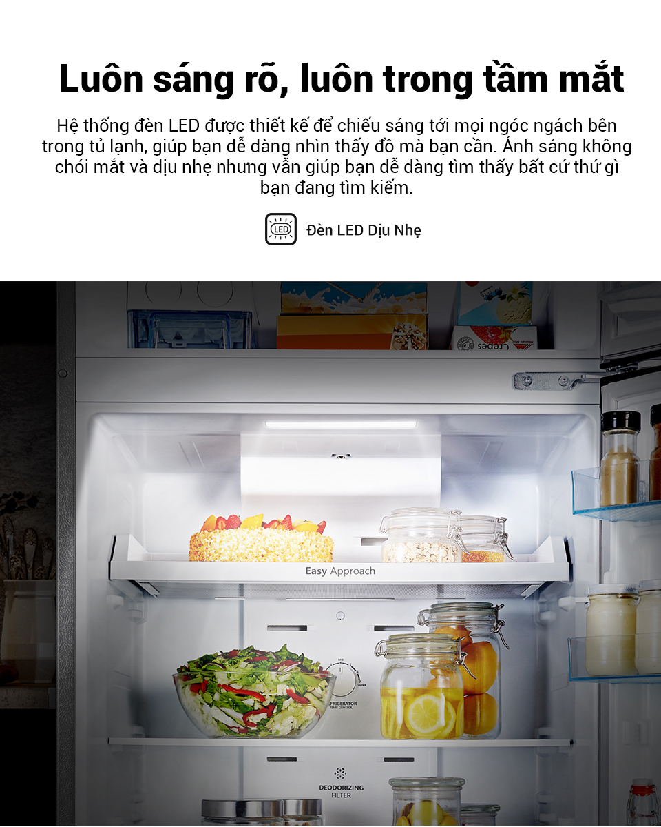 - Đèn LED Dịu Nhẹ, Luôn Sáng Rõ, Luôn Trong Tầm Mắt: Hệ thống đèn LED được thiết kế để chiếu sáng tới mọi ngóc ngách bên trong tủ lạnh, giúp bạn dễ dàng nhìn thấy đồ mà bạn cần. Ánh sáng không chói mắt và dịu nhẹ nhưng vẫn giúp bạn dễ dàng tìm thấy bất cứ thứ gì bạn đang tìm kiếm.