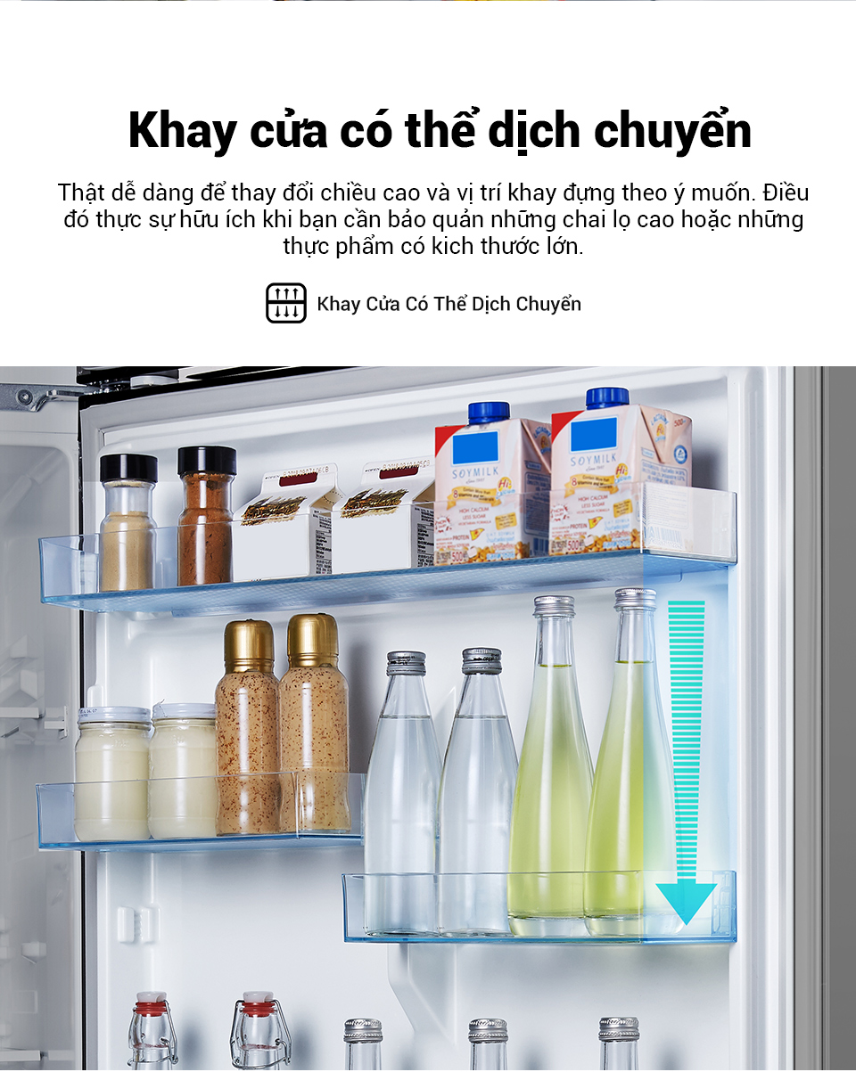 - Khay Cửa Có Thể Dịch Chuyển: Thật dễ dàng để thay đổi chiều cao và vị trí khay đựng theo ý muốn. Điều đó thực sự hữu ích khi bạn cần bảo quản những chai lọ cao hoặc những thực phẩm có kich thước lớn.