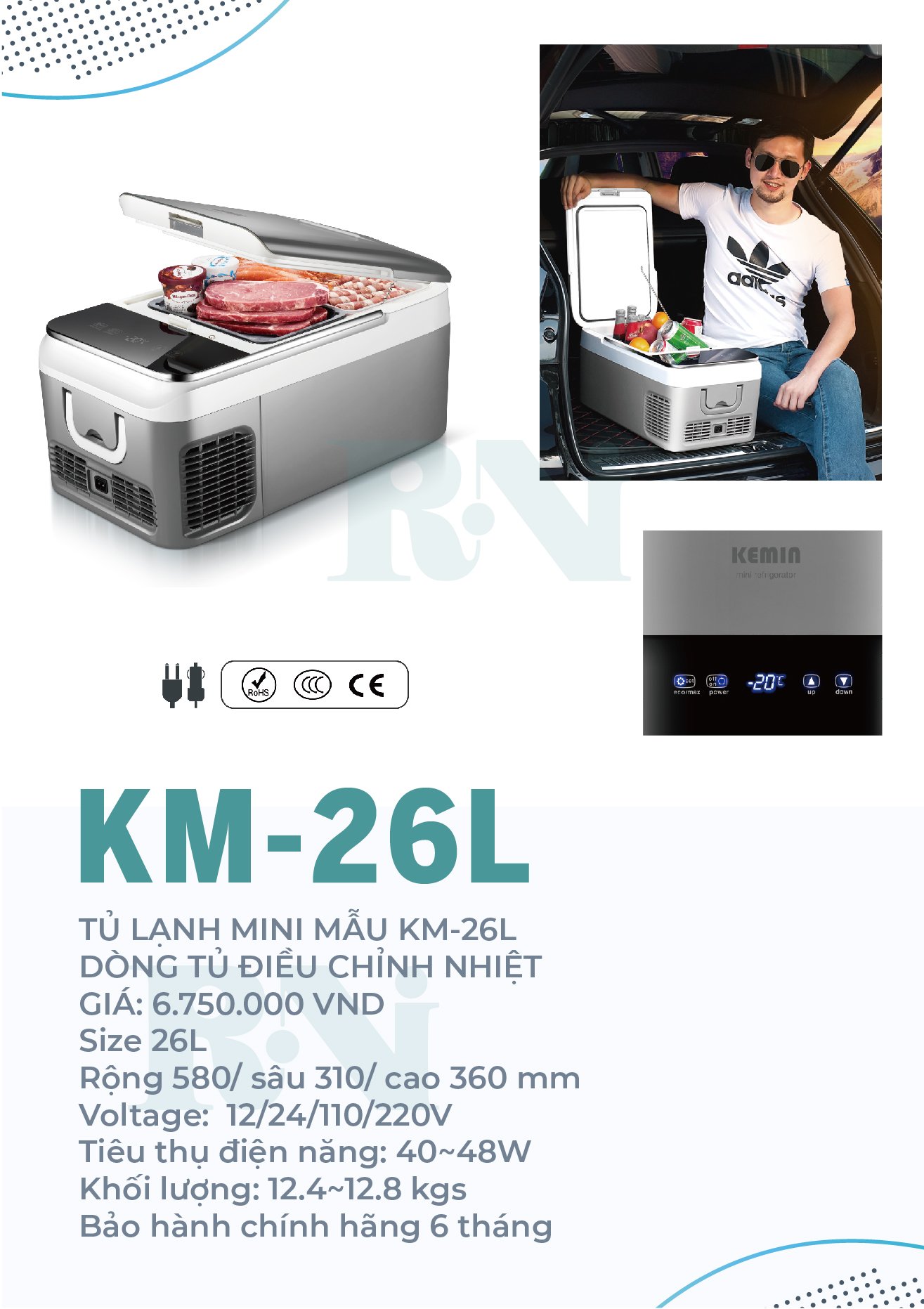 Mua tại TiktokMÔ TẢ SẢN PHẨM Đến từ thương hiệu Kemin nổi tiếng về điện tử điện lạnh, Kemin KM-26L là chiếc tủ lạnh di động cao cấp mà bạn luôn tìm kiếm cho mỗi chuyến đi của gia đình. Với thiết kế cao cấp, tủ lạnh di động Kemin KM-26L mang đến khả năng sử dụng linh hoạt, vận hành vô cùng mạnh mẽ có thể làm lạnh đến -20°C, phù hợp sử dụng khi đi du lịch, dã ngoại hay vui chơi ngoài trời, giúp giữ lạnh, tươi sống thực phẩm, phục vụ nhu cầu ăn uống, ngoài ra với bộ Adapter đổi nguồn đi kèm bạn có thể sử dụng nó trong gia đình với mọi công năng như một chiếc tủ lạnh thông thường. THÔNG SỐ KỸ THUẬT – Thương hiệu: Kemin – Dung tích: 26 lít – Phạm vi nhiệt độ: -20 ℃ đến + 10 ℃ – Kích thước ngoài (Dài x Rộng x Cao): 580 x 280 x 360mm