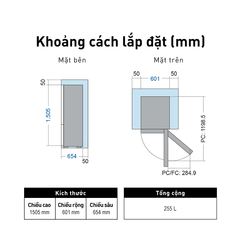 THÔNG SỐ KỸ THUẬT Dung tích tổng (Liter): 264 ℓ Chiều rộng (mm): 555 mm Chiều cao thực có bản lề(mm): 1635 mm Chiều sâu với tay cầm cửa(mm): 637 mm Khối lượng thực(kg): 47.5