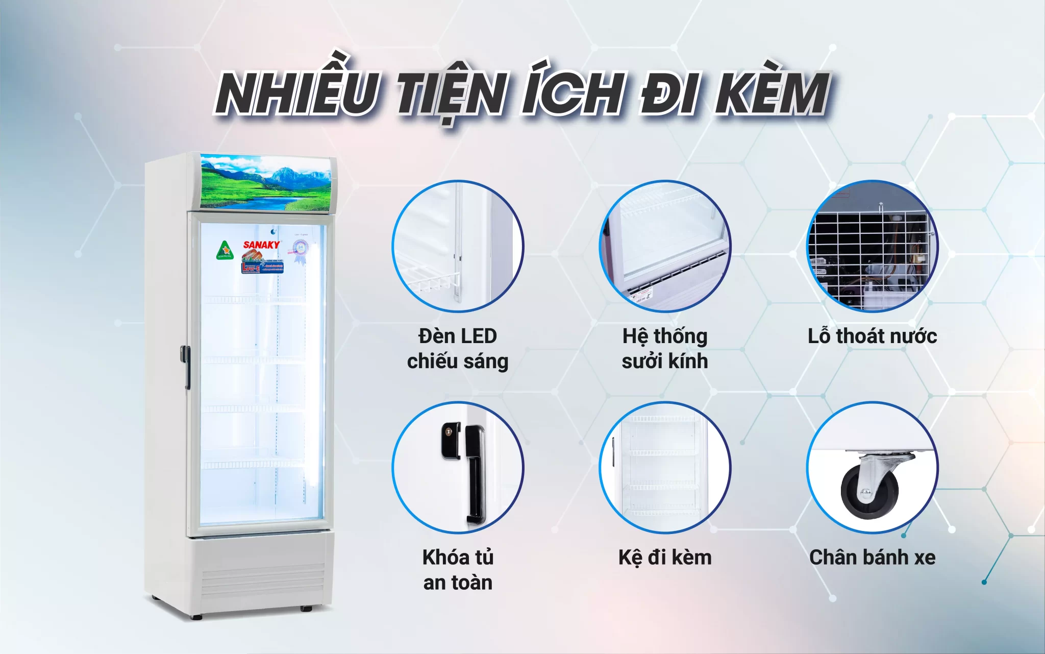 Được trang bị cửa kính công nghệ Low-E, đây được xem là sản phẩm chất lượng cao của ngành kính xây dựng. Lớp cửa kính của tủ mát Sanaky giúp hạn chế tia UV năng lượng cao của ánh sáng trắng và tia hồng ngoại mang nhiệt thâm nhập vào tủ. Hạn chế đọng sương hay hơi nước trên lớp cánh tủ khi tủ vận hành nhờ khả năng cách nhiệt của kính. Hơn nữa, kính giúp cân bằng ánh sáng tốt hơn, không gây chói mắt khi nhìn từ ngoài vào tủ.