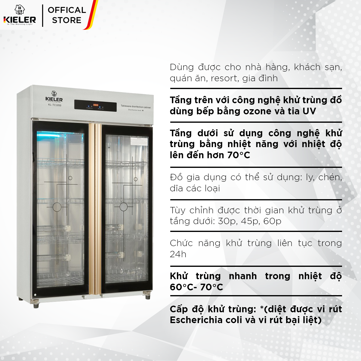TủKhửTrùngKieler #KLTC1050 #KhửTrùng #ChếBiếnThứcĂn #BảoQuảnThựcPhẩm #AnToànVệSinh #TiệnÍchBếp #HơiNước #TiaUV