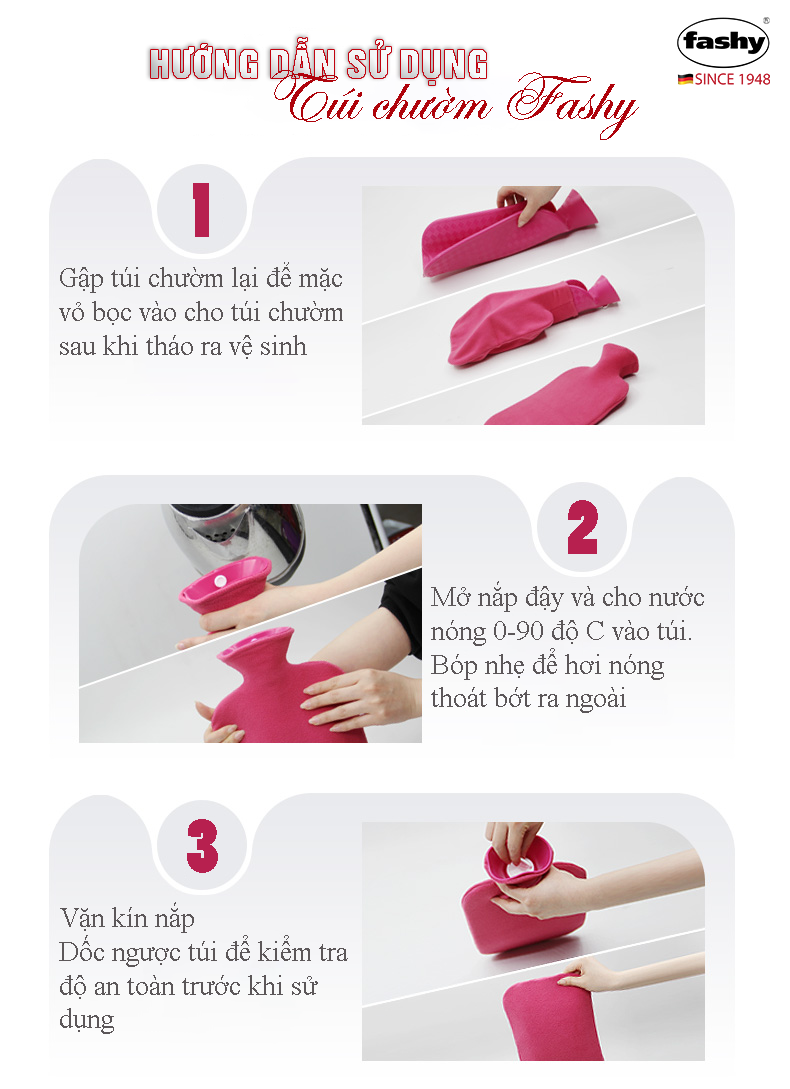 - Túi chườm nóng thương hiệu Fashy – Đức được thiết kế với kiểu dáng thời trang, rất tiện dụng và an toàn khi sử dụng.