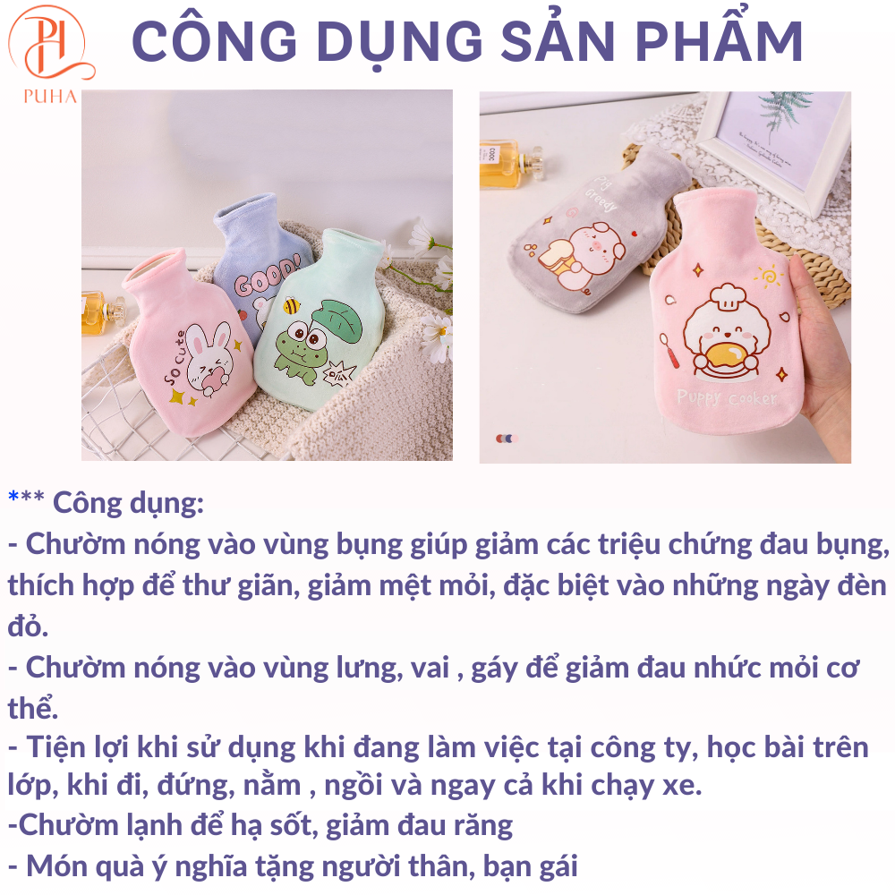 Mô Tả Sản Phẩm Túi chườm nóng lạnh PUHA 350ml, túi chườm sưởi ấm giảm đau bụng kinh họa tiết dễ thương