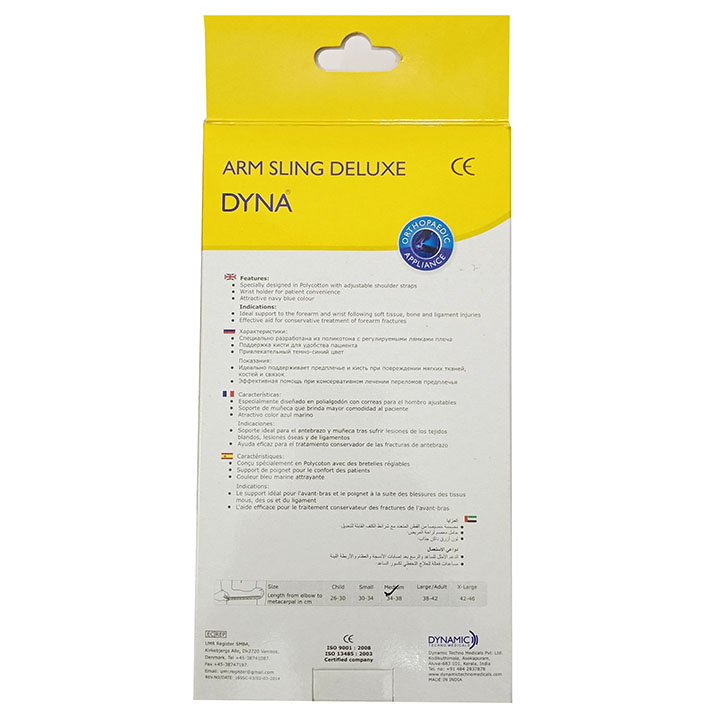 Mua tại TiktokTúi đeo tay cao cấp Dyna Đặc điểm nổi bật: -Hàng nhập khẩu cao cấp chính hãng theo tiêu chuẩn Châu Âu. -Thiết kế ôm gọn cánh tay, giúp cố định cổ tay tốt hơn -Hỗ trợ tốt cho việc hỗ trợ điều trị gãy xương cánh tay. -Nâng đỡ tốt cho bệnh nhân gãy thân xương cẳng tay. Đặc điểm sản phẩm: -Làm bằng chất liệu Polycotton thiết kế đặc biệt với dây đeo vai dễ dàng điều chỉnh -Miếng đệm trên dây đeo qua vai có thể điều chỉnh tốt, làm giảm đau hay mỏi cổ -Đeo vào cánh tay vòng qua ngón tay cái -Thiết kế ôm gọn cánh tay, cố định cổ tay và giữ ngón tay cái, giúp cánh tay cân bằng ở vị trí. -Trong túi có khóa để giữ ngón tay ở vị trí sinh lý khi sử dụng Chỉ định: -Hỗ trợ lý tưởng cho bệnh nhân bị chấn thương cổ tay cẳng tay, mô mềm, tổn thương dây chằng và xương. -Hỗ trợ tốt cho việc hỗ trợ điều trị gãy xương cẳng tay. -Hỗ trợ cho bệnh nhân tai biến mạch máu não giai đoạn liệt -Nâng đỡ cho bệnh nhân gãy thân xương cánh tay và gãy pouteau colles, khớp vai, khớp khuỷu giai đoạn bó bột và sau phẫu thuật -Tổn thương đám rối thần kinh cánh tay. Sản xuất và nhập khẩu: Sản phẩm đạt tiêu chuẩn CHÂU ÂU do hãng DYNAMIC của Ấn Độ sản xuất xuất khẩu trên 35 nước trên thế giới bao gồm Anh, Mỹ, EU, châu Á... Size: Đo chiều dài từ khuỷu đến xương bàn tay (cm) SIZE Đo chiều dài từ khuỷu đến xương bàn tay (cm) S 30-34 cm M 34-38 cm L 38-42 cm XL 42-46 cm Hướng dẫn sử dụng: -Chọn size phù hợp với người bệnh -Tư thế bệnh nhân ngồi hoặc đứng cẳng tay để về phía trước gâp 90 độ Kiểm tra nẹp: chọn túi đeo cùng kích cỡ cùng bên với tay bị tổn thương. -Lấy nẹp ra khỏi túi kiểm tra và dây đai -Bước 1: đặt tay vào túi đeo sao cho đúng chiều tay -Bước 2 : xỏ ngón cái vào 1 dây nhỏ phía trước túi để giữ ngón tay ở vị trí sinh lí -Bước 3 đeo chéo dây đai qua vai bên cạnh -Bước 4 kiểm tra lại dây đai mức độ chặt đảm bảo đủ chắc, không gây đau không gây chèn ép tuần hoàn.