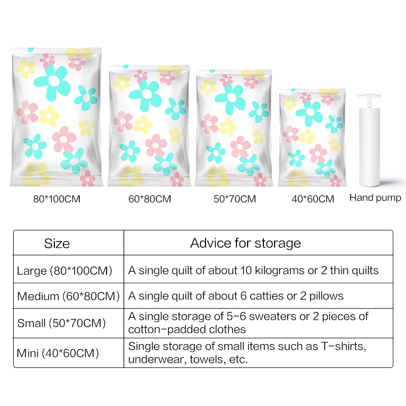 Màu sắc: Hoa và trong suốt Kích thước: Bảo hành: 1 đổi 1 trong 12 tháng lỗi nhà sản xuất TÍNH NĂNG NỔI TRỘI: Đựng và bảo quản chăn màn, ga, gối, quần áo, khăn mặt … nén lại chỉ còn 1/4 kích thước ban đầu. Giúp tủ quần áo nhà bạn sẽ gọn gàng hơn rất nhiều so với không dùng túi hút chân không Bảo vệ để không bị bụi bẩn, côn trùng, ẩm mốc, mối mọt ... tiếp xúc Đầu khóa zip đóng mở tiện lợi. Hút chân không đơn giản và nhanh chóng. - Sử dụng đơn giản, cho hiệu quả từ 8-12 tháng với mỗi lần hút chân không Chất liệu nhựa cao cấp, dày dặn, chắc chắn với độ bền cao, dễ dàng vệ sinh, làm sạch, có thể tái sử dụng nhiều lần, tiết kiệm được nhiều chi phí Hai mép khóa zip và van hút chân không được làm bằng silicon tăng khả năng đàn hồi và kín hơi Đối với những người đi du lịch, túi hút chân không cũng rất cần thiết. Quần áo được gấp gọn gàng và hút chân không làm giảm tối đa khoảng không trong va li của bạn. Bạn sẽ mang được nhiều quần áo hơn cùng 1 va li như trước đây