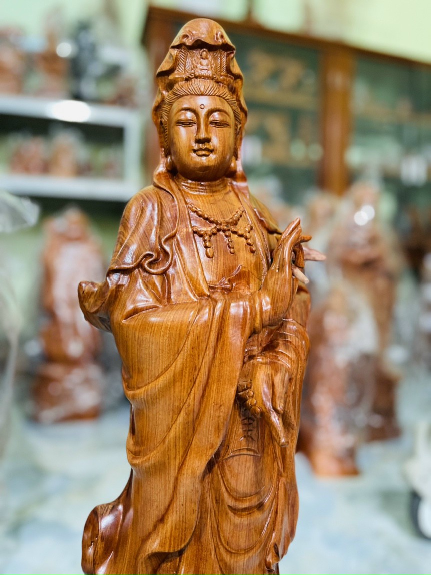 Tượng phật bà quan âm bồ tát được làm bằng chất liệu gỗ hương đá liền khối tự nhiên 100% Kích thước cao 70×20×20cm _ Tượng phật bà quan âm bồ tát được trạm khắc vô cùng tỉ mỉ ,tinh sảo kỳ công .Đi hầu hết tất cả mọi chi tiết góc ngách nội dung hoa văn của tượng đều được gọt tỉa chỉnh sửa hoàn toàn bằng tay thủ công .Đồng thời tượng được kiểm định kỹ lưỡng ,khắt khe ,như cho vào thẩm sấy cho gỗ khô kiệt .Mục đích trống dập nứt vênh mo mối mọt ,Kết hợp với trà nhám ,Đánh giấy giáp nhiều nước sờ mát lạnh ,Rồi cho vào phun lót làm bóng mờ để giữ lại mầu sắc vân gỗ tự nhiên ,Tượng được làm và hoàn thiện do bàn tay khối óc tài hoa từ những người thợ dầy rặn kinh nghiệm ,cũng như tay nghề cao trong làng nghề truyền thống .Chính vì thế tượng phật bà quan âm ,bồ tát đã đáp ứng đầy đủ những tiêu trí ( Đẹp bền rẻ ) Thẩm mỹ nghệ thuật với chất lượng tuyệt vời