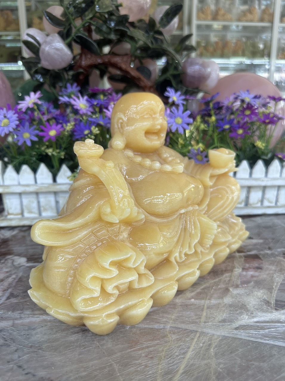 Chất liệu: Đá ngọc Hoàng Long Kích thước: Dài 50 cm x Rộng 20 cm x Cao 34 cm Khối lượng: 40 kg Phật Di Lặc trong Phong thủy Còn gọi là "Phật Cười", Di