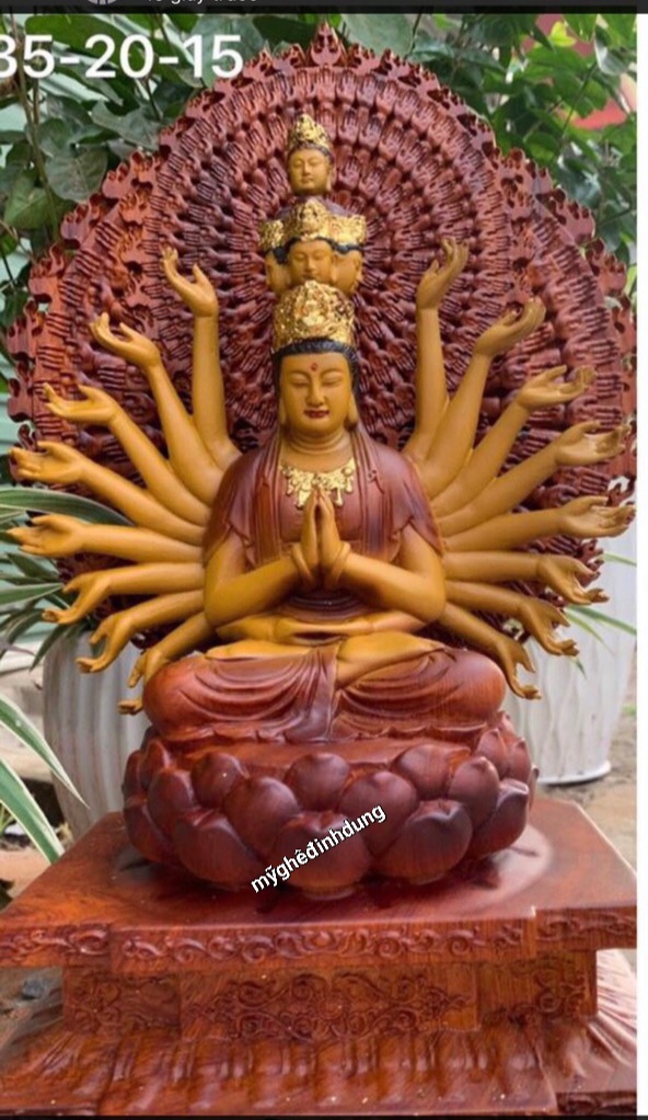 Tượng phật thiên thủ thiên nhãn được làm bằng chất liệu gỗ hương đá tự nhiên 100% Kt cao 35×20×15cm _ Tượng được chạm khắc tỉ mỉ ,tinh sảo kỳ công .Đi hầu hết tất cả mọi chi tiết góc ngách nội dung hoa văn của tượng đều gọt tỉa chỉnh sửa sắc nét hoàn toàn bằng tay thủ công .Đồng thời tượng được kiểm định kỹ lưỡng khắt khe ,như cho vào thẩm sấy cho gỗ khô kiệt .Mục đích trống dập nứt vênh mo mối mọt .Kết hợp với trà nhám ,đánh giấy giáp nhiều nước sờ mát lạnh .Song cho vào phun lót làm bóng mờ để giữ lại mầu sắc vân gỗ tự nhiên .Cũng như pu giả cổ đẹp long lanh như ảnh trên .Tượng được làm và hoàn thiện do bàn tay khối óc tài hoa ,từ những người thợ giàu kinh nghiệm trong làng nghề truyền thống .
