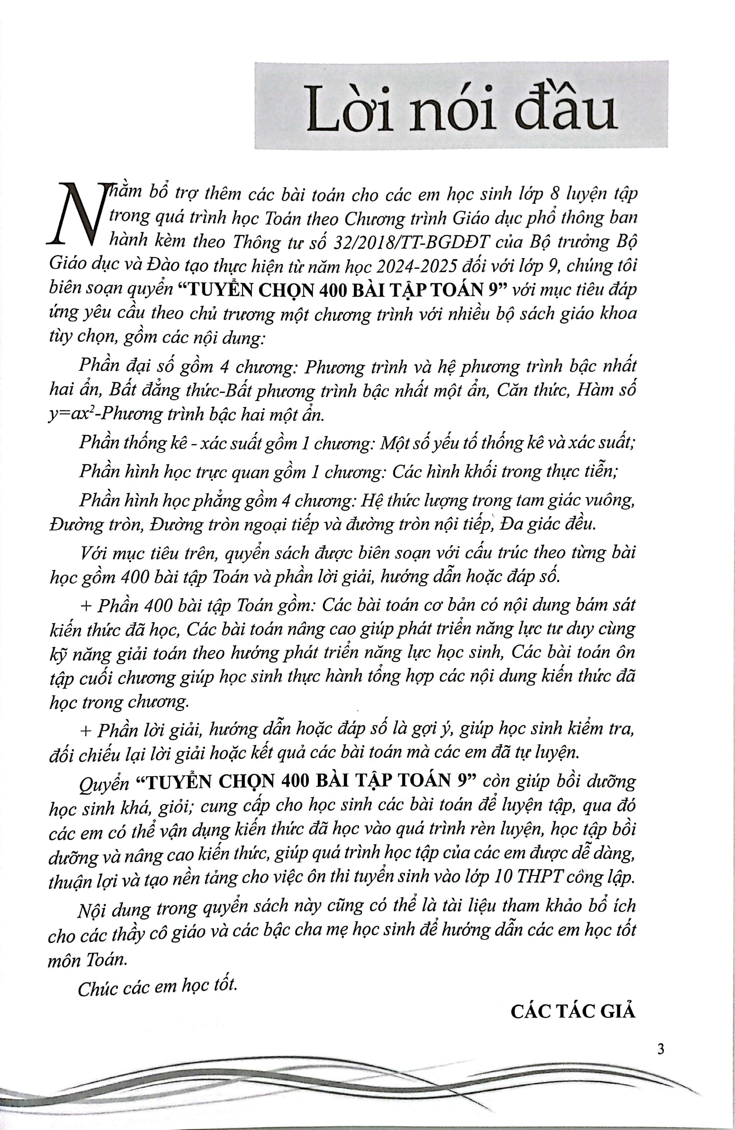 Tuyển Chọn 400 Bài Tập Toán 9 (Theo Chương Trình GDPT Mới) Cuốn sách Tuyển Chọn 400 Bài Tập Toán Lớp 9 được biên soạn nhằm đáp ứng yêu cầu củng cố, hệ thống, nâng cao và mở rộng các kiến thức của chương trình Toán lớp 9 hiện hành. Đây là tài liệu tham khảo giúp học sinh yêu thích môn Toán tự học, tự rèn luyện để nâng cao năng lực bản thân, tạo tiền đề vững chắc cho các lớp học sau này. Cuốn sách là một tài liệu tham khảo bổ ích, thiết thực cho học sinh trong quá trình học tập môn Toán ở khối lớp 9.