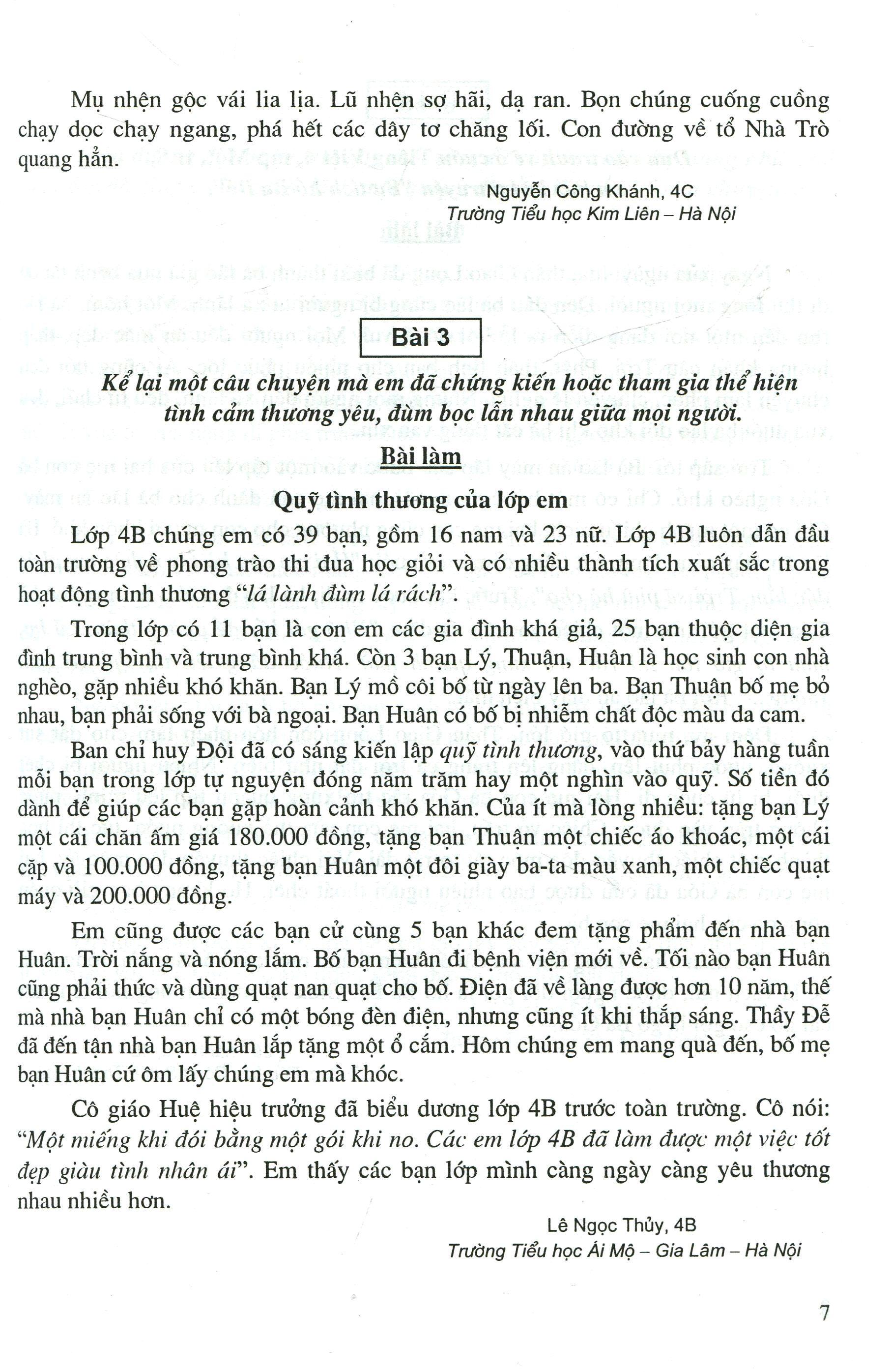 Tuyển chọn những bài văn kể chuyện bao gồm 4 cuốn, chia theo các lớp ở bậc tiểu học từ lớp 2 đến lớp 5. Sách được biên soạn với mong muốn giúp các em học sinh có thêm tài liệu tự đọc và tự học.Các bài văn kể chuyện theo các dạng bài, kiểu bài sau: kể chuyện theo tranh, kể chuyện theo câu chuyện được học ở bài Tập đọc, kể chuyện về một câu chuyện dựa theo trí nhớ qua việc đọc sách hoặc được nghe kể. Có bài kể chuyện sáng tạo mà người kể phải nhập vai vào nhân vật trong câu chuyện, có hình thức phân vai, dựng lại câu chuyện. Lên lớp trên, Văn kể chuyện viết về người thật, việc thật, kể lại một kỷ niệm sâu sắc, cao hơn nữa là kể chuyện tưởng tượng.Các bài văn kể chuyện trong cuốn sách này phần lớn được tuyển chọn qua các bài văn đạt điểm cao của các em học sinh tiểu học.