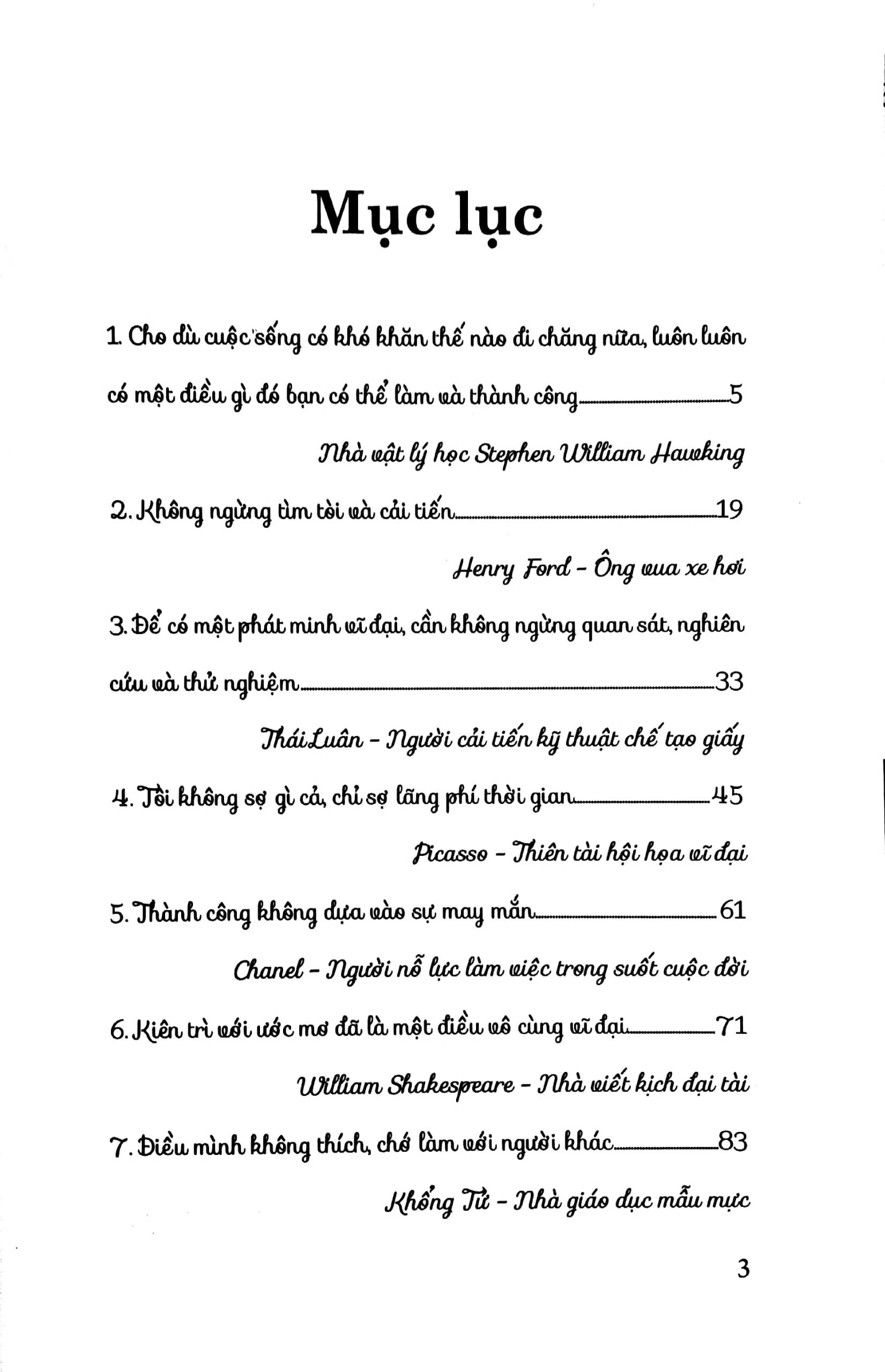 Vậy, họ đã làm thế nào để có thể chạm tới ngưỡng cửa của thành công? Newton đã làm thế nào để phát hiện ra định luật vạn vật hấp dẫn nổi tiếng trong vật lý học? Pierre Curie và Marie Curie làm gì để tìm ra hai nguyên tố phóng xạ polonium và radium? Điều gì đã khiến Andersen viết ra được những câu truyện được hàng triệu trẻ em và người lớn trên thế giới yêu thích?...