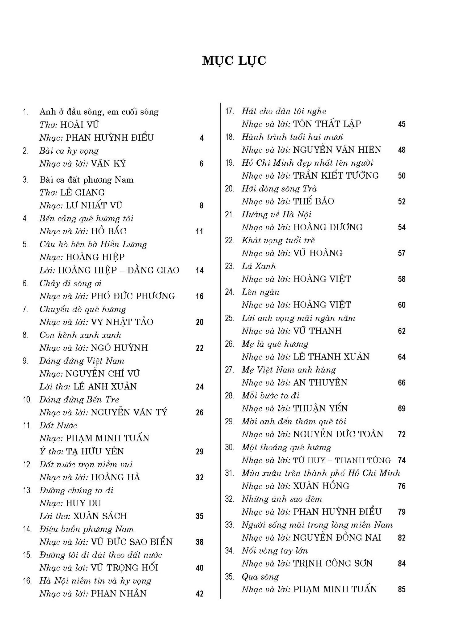 Mua tại TiktokCuốn sách Tuyển Tập Tình Ca Quê Hương - Việt Nam Quê Hương Tôi bao gồm các tác phẩm: Anh ở đầu sông, em cuối sông; Bài ca đất Phương Nam; Bài Ca Hy Vọng,; Bến Cảng Quê Hương Tôi; Đất nướ