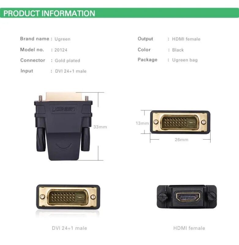 Ugreen 20124 DVI 24+1 Male To HDMI 1080P Female Adapter Gold Connect Converter 1. HDMI adapter dvi vga adapter connector converter - DVI24 + 1 male to HDMI female adapter 2. Color: Black 3. 100
