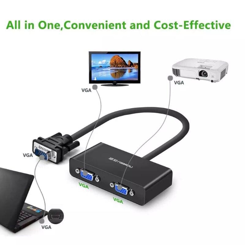 Sản phẩm chỉ chia được thành 2 cổng VGA, không xuất được ra 2 màn hình phát cùng lúc, tức là khi cắm cổng này thì cổng kia ko dùng được. Cáp chia VGA 1