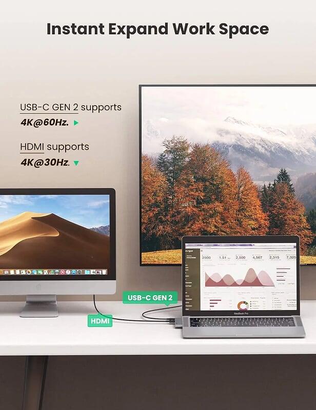 Ugreen 90325 USB type C to 1xusb A 10G + 1xusb-C 10G + 2xusb-A 5G + 2xHDMI 4K60Hz + DP + RJ45 Gigabit + SD/TF + 3.5mm Audio + PD Multifunction Docking Station MST for